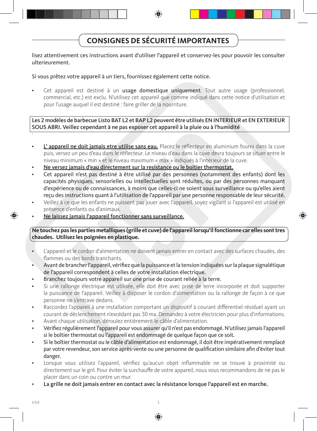 Les 2 modèles de barbecue Listo BAT L2 et BAP L2 peuvent être utilisés EN INTERIEUR et EN EXTERIEUR SOUS ABRI. Veillez cependant à ne pas exposer cet apparéil à la pluie ou à l'humidité