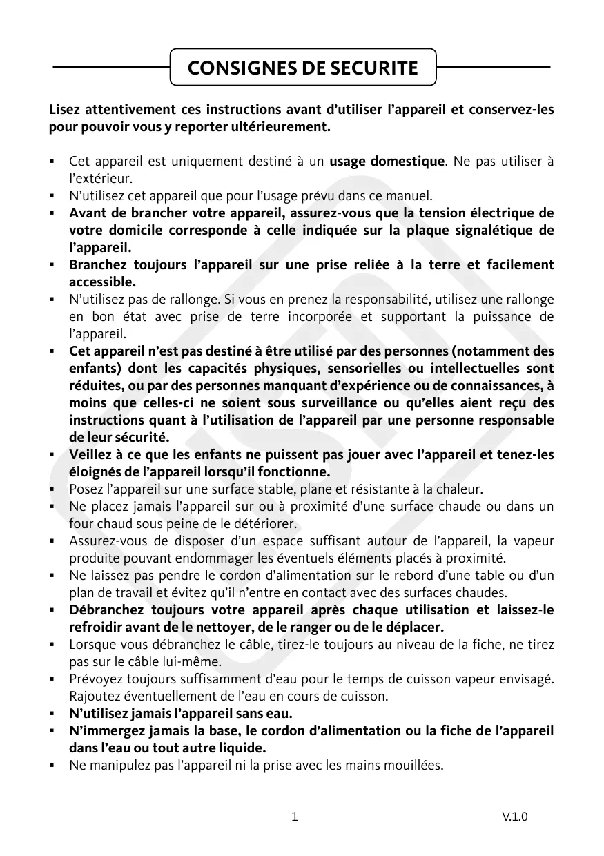 Lisez attentivement ces instructions avant d’utiliser l’appareil et conservez-les pour pouvoir vous y reporter ultérieurement. Cet appareil est uniquement destiné à un usage domestique. Ne pas utiliser à l’extérieur. N’utilisez cet appareil que pour l’usage prévu dans ce manuel. Avant de brancher votre appareil, assurez-vous que la tension électrique de votre domicile corresponde à celle indiquée sur la plaque signalétique de l’appareil. Branchez toujours l’appareil sur une prise reliée à la terre et facilement accessible. N’utilisez pas de rallonge. Si vous en prenez la responsabilité, utilisez une rallonge en bon état avec prise de terre incorporée et supportant la puissance de l’appareil. Cet appareil n’est pas destiné à être utilisé par des personnes (notamment des enfants) dont les capacités physiques, sensorielles ou intellectuelles sont réduites, ou par des personnes manquant d’expérience ou de connaissances, à moins que celles-ci ne soient sous surveillance ou qu’elles aient reçu des instructions quant à l’utilisation de l’appareil par une personne responsable de leur sécurité. Veillez à ce que les enfants ne puissent pas jouer avec l’appareil et tenez-les éloignés de l’appareil lorsqu’il fonctionne. Posez l’appareil sur une surface stable, plane et résistante à la chaleur. Ne placez jamais l’appareil sur ou à proximité d’une surface chaude ou dans un four chaud sous peine de le détériorer. Assurez-vous de disposer d’un espace suffisant autour de l’appareil, la vapeur produite pouvant endommager les éventuels éléments placés à proximité. Ne laissez pas pendre le cordon d’alimentation sur le rebord d’une table ou d’un plan de travail et évitez qu’il n’entre en contact avec des surfaces chaudes. Débranchez toujours votre appareil après chaque utilisation et laissez-le refroidir avant de le nettoyer, de le ranger ou de le déplacer. Lorsque vous débranchez le câble, tirez-le toujours au niveau de la fiche, ne tirez pas sur le câble lui-même. Prévoyez toujours suffisamment d’eau pour le temps de cuisson vapeur envisagé. Rajoutez éventuellement de l’eau en cours de cuisson. N’utilisez jamais l’appareil sans eau. N’immergez jamais la base, le cordon d’alimentation ou la fiche de l’appareil dans l’eau ou tout autre liquide. Ne manipulez pas l’appareil ni la prise avec les mains mouillées.