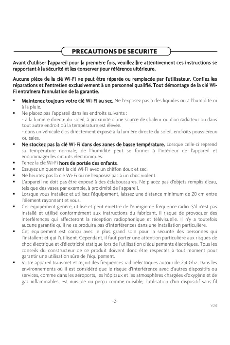 Aucune pièce de la clé Wi-Fi ne peut être répartirée ou remplaçaé par l'utillisateur. Confiez les répartitions et l'entretien exclusivement à un personnel qualifié. Tout démontré de la clé Wi-Fi entraînera l'annulation de la garantie.