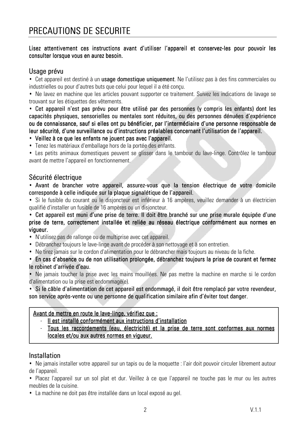 • Avant de brancher votre appareil, assurezassurez- vous que la tension électrique de votre domicile corresponde à celle indiquée sur la plaque signalétique de l’appareil. • Si le fusible du courant ou le disjoncteur est inférieur à 16 ampères, veuillez demander à un électricien qualifié d'installer un fusible de 16 ampères ou un disjoncteur. • Cet appareil est muni d’une prise de terre. Il doit être branché sur une prise murale équipée d’une prise de terre, correctement installée et reliée au réseau électrique conformément aux normes en vigueur. • N'utilisez pas de rallonge ou de multiprise avec cet appareil. • Débranchez toujours le lave-linge avant de procéder à son nettoyage et à son entretien. • Ne tirez jamais sur le cordon d'alimentation pour le débrancher mais toujours au niveau de la fiche. • En cas d’absence ou de non utilisation prolongée, débranchez débranchez toujours la prise de courant et fermez le robinet d’arrivée d’eau. • Ne jamais toucher la prise avec les mains mouillées. Ne pas mettre la machine en marche si le cordon d'alimentation ou la prise est endommagé(e). • Si le câble d’alimentation de cet appareil est endommagé, il doit être remplacé par votre revendeur, son service aprèsaprès - vente ou une personne per sonne de qualification similaire afin d’éviter tout danger. Avant de mettre en route le lavelave- linge, vérifiez que : - Il est installé conformément conformément aux instructions d’installation - Tous les raccordements (eau, électricité) et la prise de terre sont conformes aux normes locales et/ou aux autres normes en vigueur.