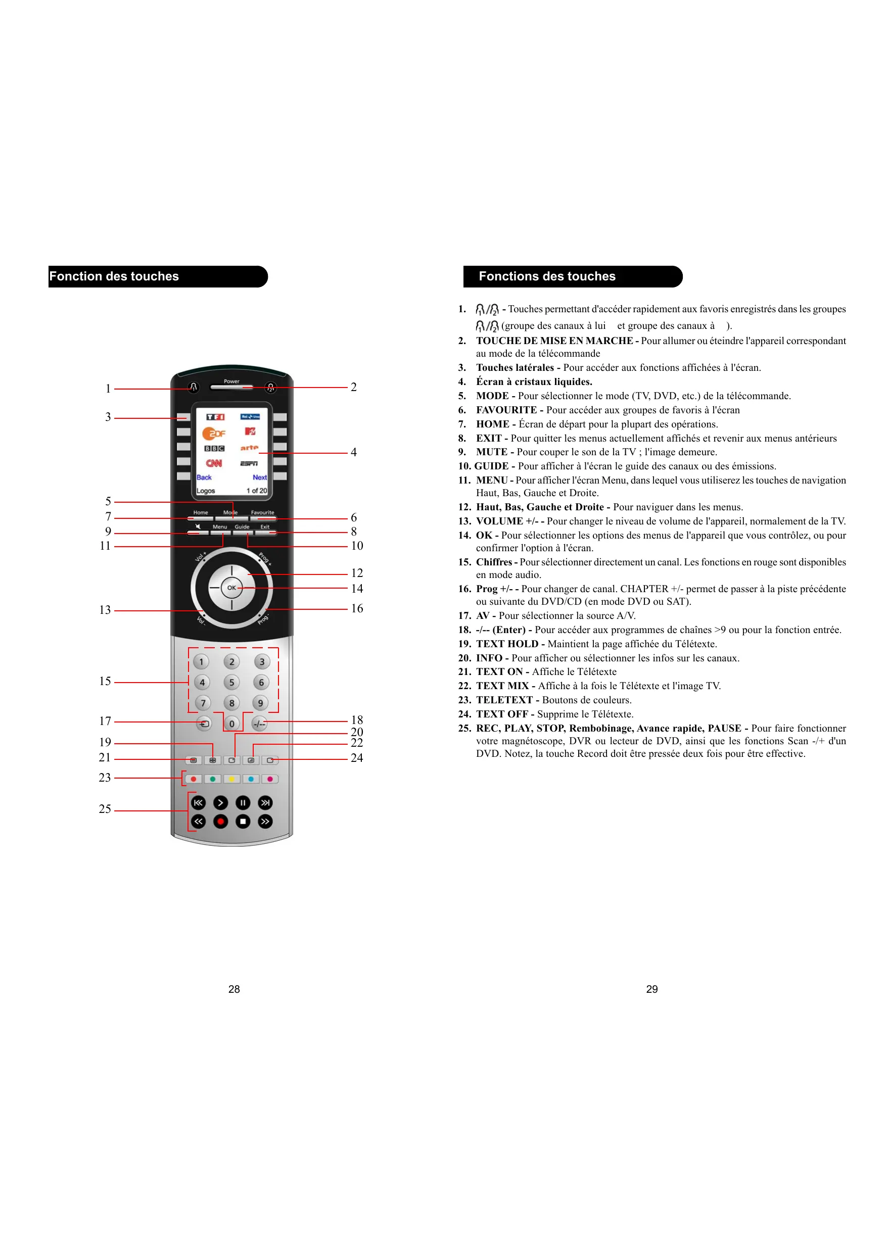 15. Chiffres - Pour sélectionner directement un canal. Les fonctions en rouge sont disponibles