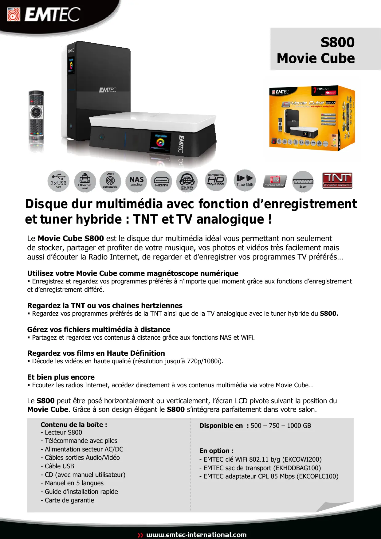 Le Movie Cube S800 est le disque dur multimédia idéal vous permettant non seulement de stocker, partager et profiter de votre musique, vos photos et vidés très facilement mais aussi d'écouter la Radio Internet, de regarder et d'enregistrer vos programmes TV préféres...