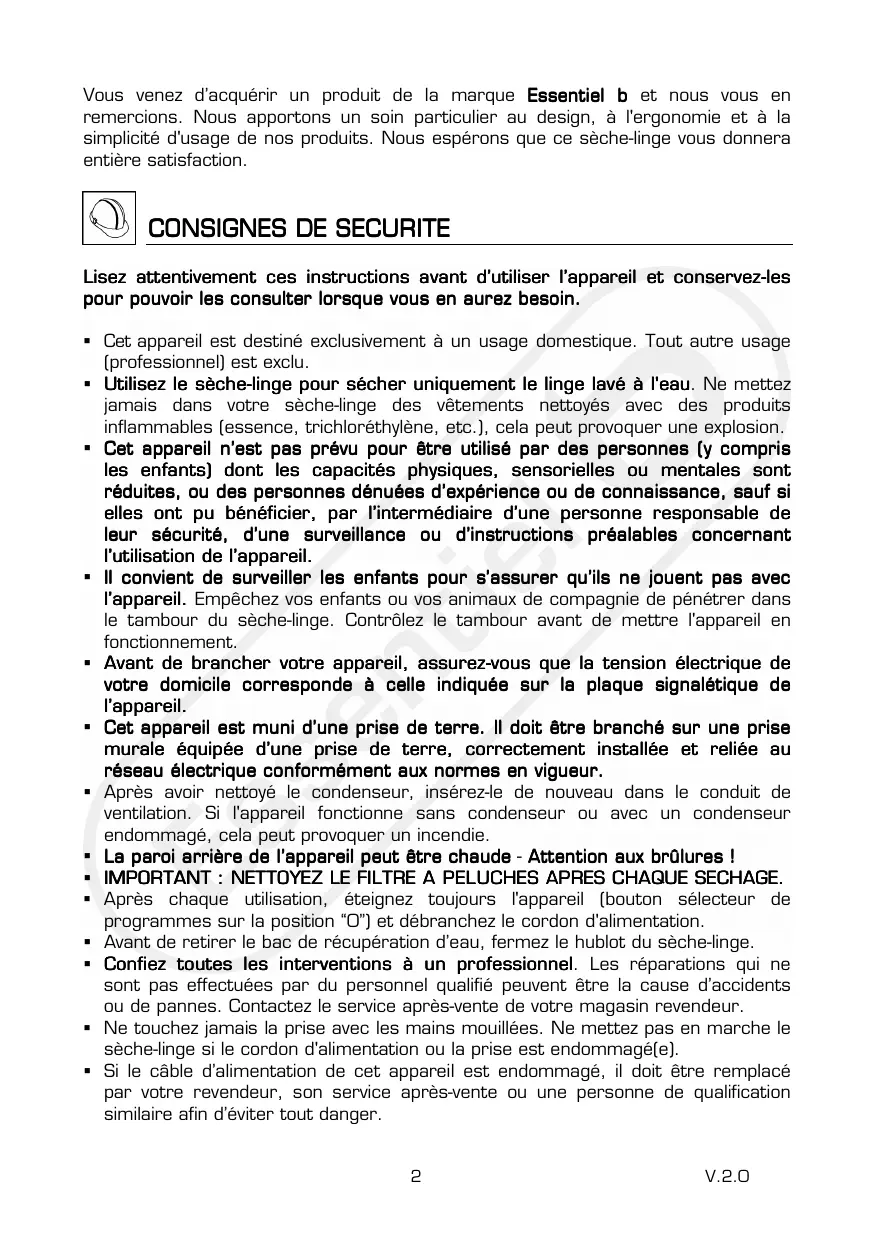 Vouse venez d'acquérir un produit de la marque Essentiel b et nous vous en remercions. Nous apportons un soin particulier au design, à l'ergonomie et à la simplicité d'utilisation de nos produits. Nous espérons que ce sèche-linge vous donnera entière satisfaction.
