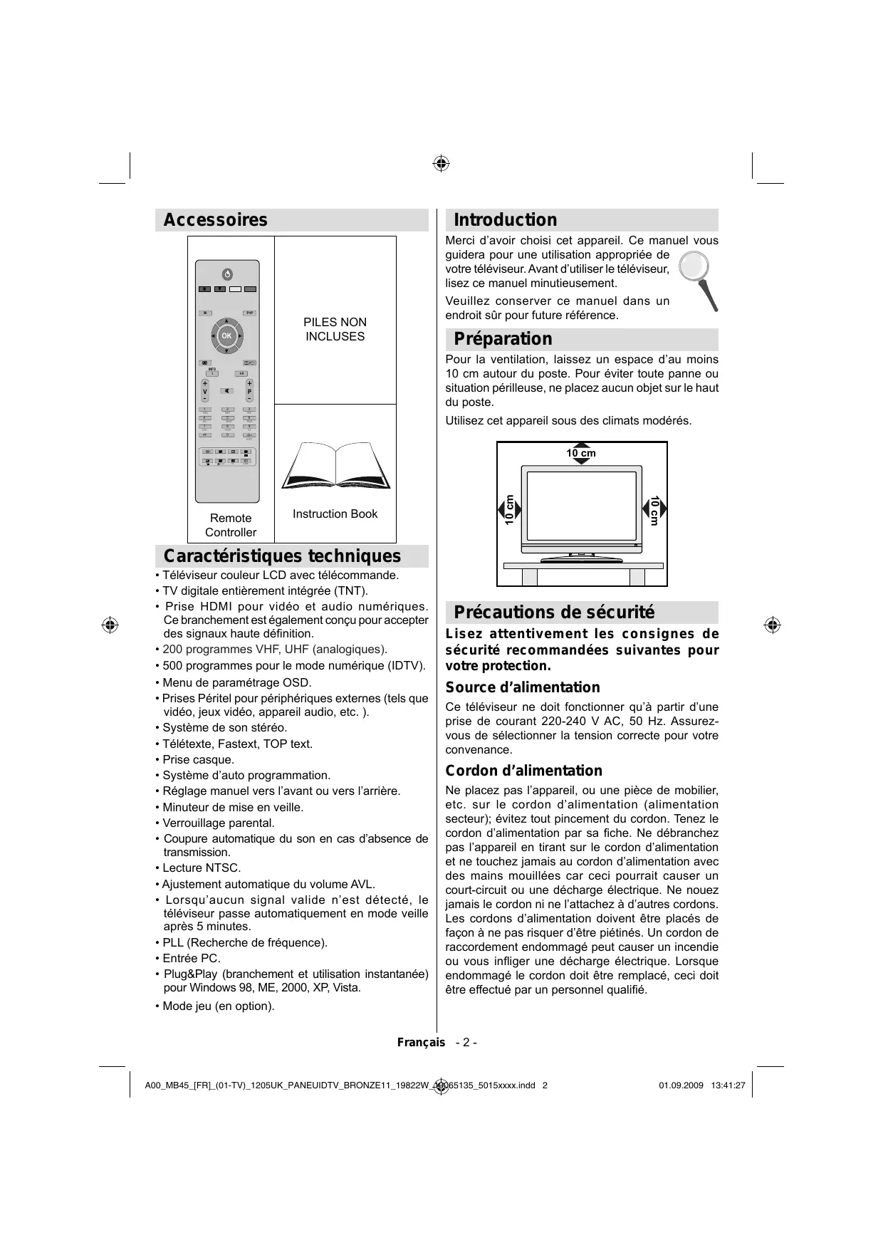 Débranchement de l’appareil 3 Volume du casque d’écoute 3 Installation 3 Ecran LCD 3 Connexion à un lecteur de DVD 8 Utilisation des prises AV latérales 9 Connexion d’un autre équipement via Péritel 9 Insertion des piles dans la télécommande 9 Allumer/éteindre le téléviseur 9 Pour allumer le téléviseur 9 Pour éteindre le téléviseur 9 Sélection d’entrée 10 Opérations de Base 10 Fonctionnement avec les boutons sur la TV 10 Réglages initiaux 10 Fonctionnement général 11 Guide de programme électronique EPG 11 Affichage des sous-titres 12 Télétexte numérique (** seulement pour le Royaume-Uni) 12 Télétexte Analogique 12 Grand écran 12 Système de menu IDTV 12 Son 27 Télécommande 27 Sources d’entrée 27 Appendice A : Modes d’affichage typiques de l’entrée PC 28 Appendice B : Compatibilité du signal AV et HDMI (types de signal d’entrée) 29 Caractéristiques techniques 30