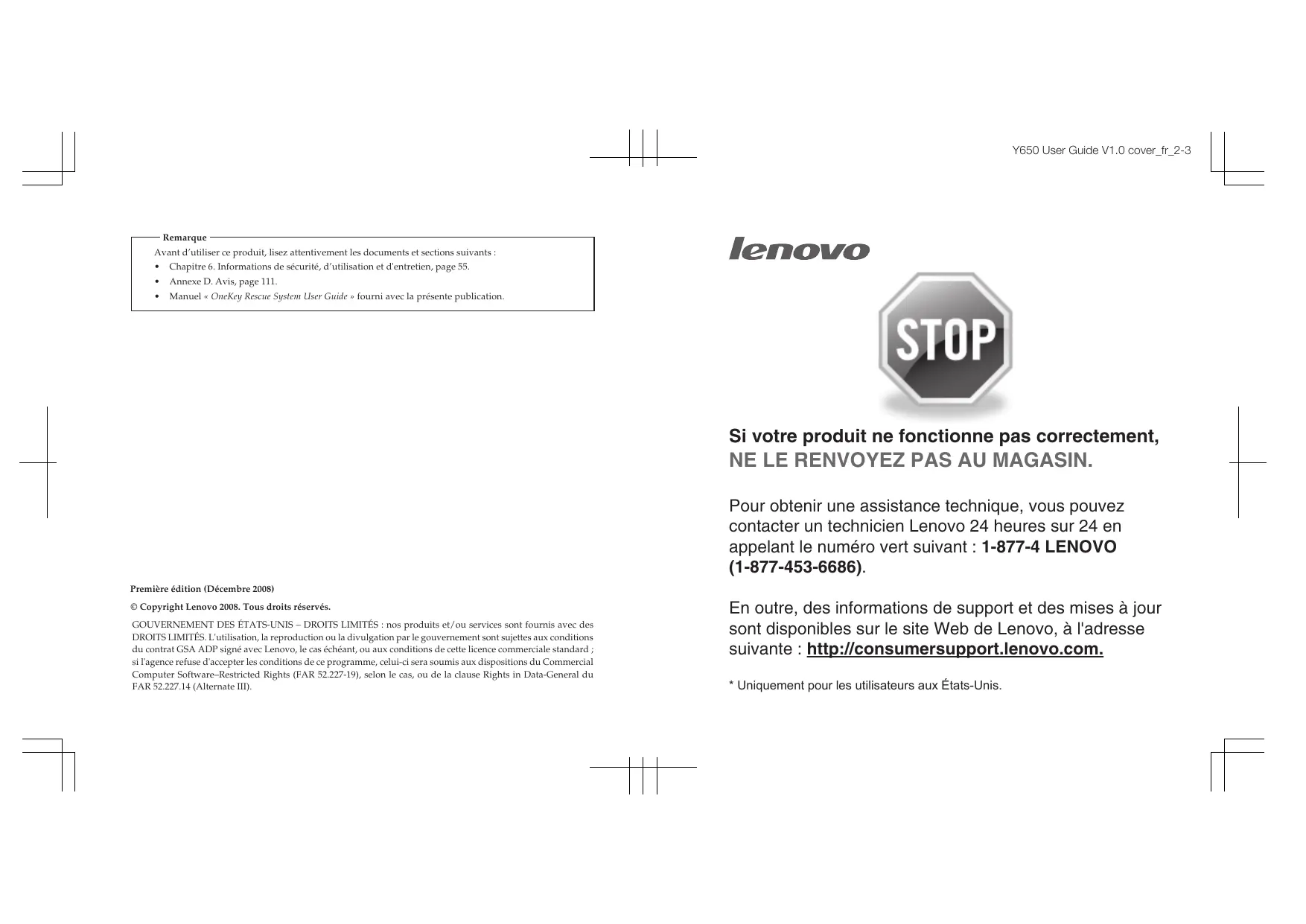 NE LE RENVOYEZ PAS AU MAGASIN. Pour obtenir une assistance technique, vous pouvez contacter un technicien Lenovo 24 heures sur 24 en appelant le numéro vert suivant : 1-877-4 LENOVO (1-877-453-6686). Première édition (Décembre 2008) © Copyright Lenovo 2008. Tous droits réservés. GOUVERNEMENT DES ÉTATS-UNIS – DROITS LIMITÉS : nos produits et/ou services sont fournis avec des DROITS LIMITÉS. L'utilisation, la reproduction ou la divulgation par le gouvernement sont sujettes aux conditions du contrat GSA ADP signé avec Lenovo, le cas échéant, ou aux conditions de cette licence commerciale standard ; si l'agence refuse d'accepter les conditions de ce programme, celui-ci sera soumis aux dispositions du Commercial Computer Software–Restricted Rights (FAR 52.227-19), selon le cas, ou de la clause Rights in Data-General du FAR 52.227.14 (Alternate III).