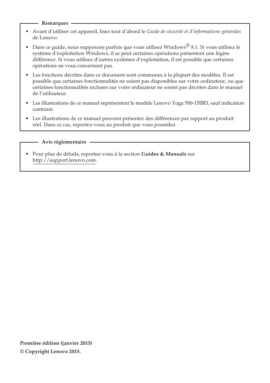 - Les illustrations de ce manuel représentent le modèle Lenovo Yoga 500-15IBD, sauf indication contraire.
