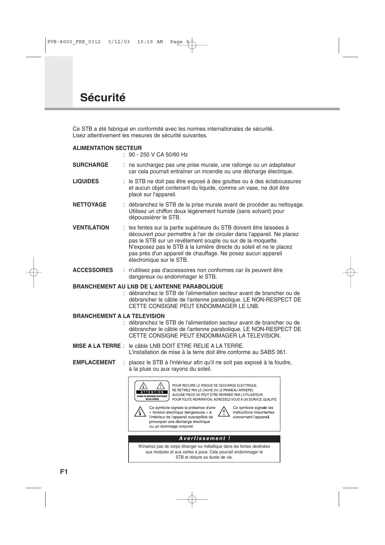 PVR-8000_FRE_0312 3/12/03 10:19 AM Page 5 Table des mati res Sécurité ----------------------------------------------- F1 ~ F2 Avertissement et glossaire------------------------ F3 Références ------------------------------------------- F4 Branchements du STB ---------------------------- F5 ~ F10 Télécommande ------------------------------------- F11 ~ F12 Guide des fonctions -------------------------------- F13 ~ F16 Guide du menu principal -------------------------- F17 ~ F43 Enregistreur sur disque dur ---------------------- F44 ~ F51 Système motorisé ---------------------------------- F52 ~ F53 Guide de dépannage ------------------------------ F54 ~ F55 Spécifications --------------------------------------- F56 ~ F58 Plan du menu --------------------------------------- F59 ~ F60 PVR-8000_FRE_0312 3/12/03 10:19 AM Page 6 Sécurité Ce STB a été fabriqué en conformité avec les normes internationales de sécurité. Lisez attentivement les mesures de sécurité suivantes. ALIMENTATION SECTEUR : 90 - 250 V CA 50/60 Hz SURCHARGE : ne surchargez pas une prise murale, une rallonge ou un adaptateur car cela pourrait entraîner un incendie ou une décharge électrique. LIQUIDES : le STB ne doit pas être exposé à des gouttes ou à des éclaboussures et aucun objet contenant du liquide, comme un vase, ne doit être placé sur l'appareil. NETTOYAGE : débranchez le STB de la prise murale avant de procéder au nettoyage. Utilisez un chiffon doux légèrement humide (sans solvant) pour dépoussiérer le STB. VENTILATION : les fentes sur la partie supérieure du STB doivent être laissées à découvert pour permettre à l'air de circuler dans l'appareil. Ne placez pas le STB sur un revêtement souple ou sur de la moquette. N'exposez pas le STB à la lumière directe du soleil et ne le placez pas près d'un appareil de chauffage. Ne posez aucun appareil électronique sur le STB. ACCESSOIRES : n'utilisez pas d'accessoires non conformes car ils peuvent être dangereux ou endommager le STB.