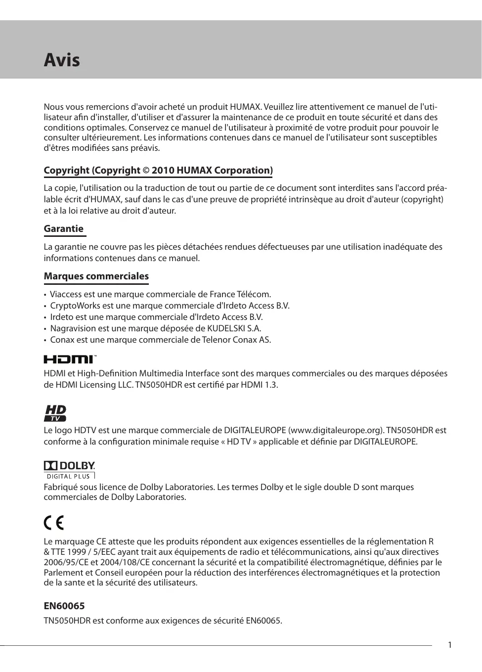 Viaccess est une marque commerciale de France Télécom. CryptoWorks est une marque commerciale d'Irdeto Access B.V. Irdeto est une marque commerciale d'Irdeto Access B.V. Nagravision est une marque déposée de KUDELSKI S.A. Conax est une marque commerciale de Telenor Conax AS. HDMI et High-Definition Multimedia Interface sont des marques commerciales ou des marques déposées de HDMI Licensing LLC. TN5050HDR est certifié par HDMI 1.3. Le logo HDTV est une marque commerciale de DIGITALEUROPE (www.digitaleurope.org). TN5050HDR est conforme à la configuration minimale requise « HD TV » applicable et définie par DIGITALEUROPE. Fabriqué sous licence de Dolby Laboratories. Les termes Dolby et le sigle double D sont marques commerciales de Dolby Laboratories. Le marquage CE atteste que les produits répondent aux exigences essentielles de la réglementation R & TTE 1999 / 5/EEC ayant trait aux équipements de radio et télécommunications, ainsi qu'aux directives 2006/95/CE et 2004/108/CE concernant la sécurité et la compatibilité électromagnétique, définies par le Parlement et Conseil européen pour la réduction des interférences électromagnétiques et la protection de la sante et la sécurité des utilisateurs. EN60065 TN5050HDR est conforme aux exigences de sécurité EN60065.