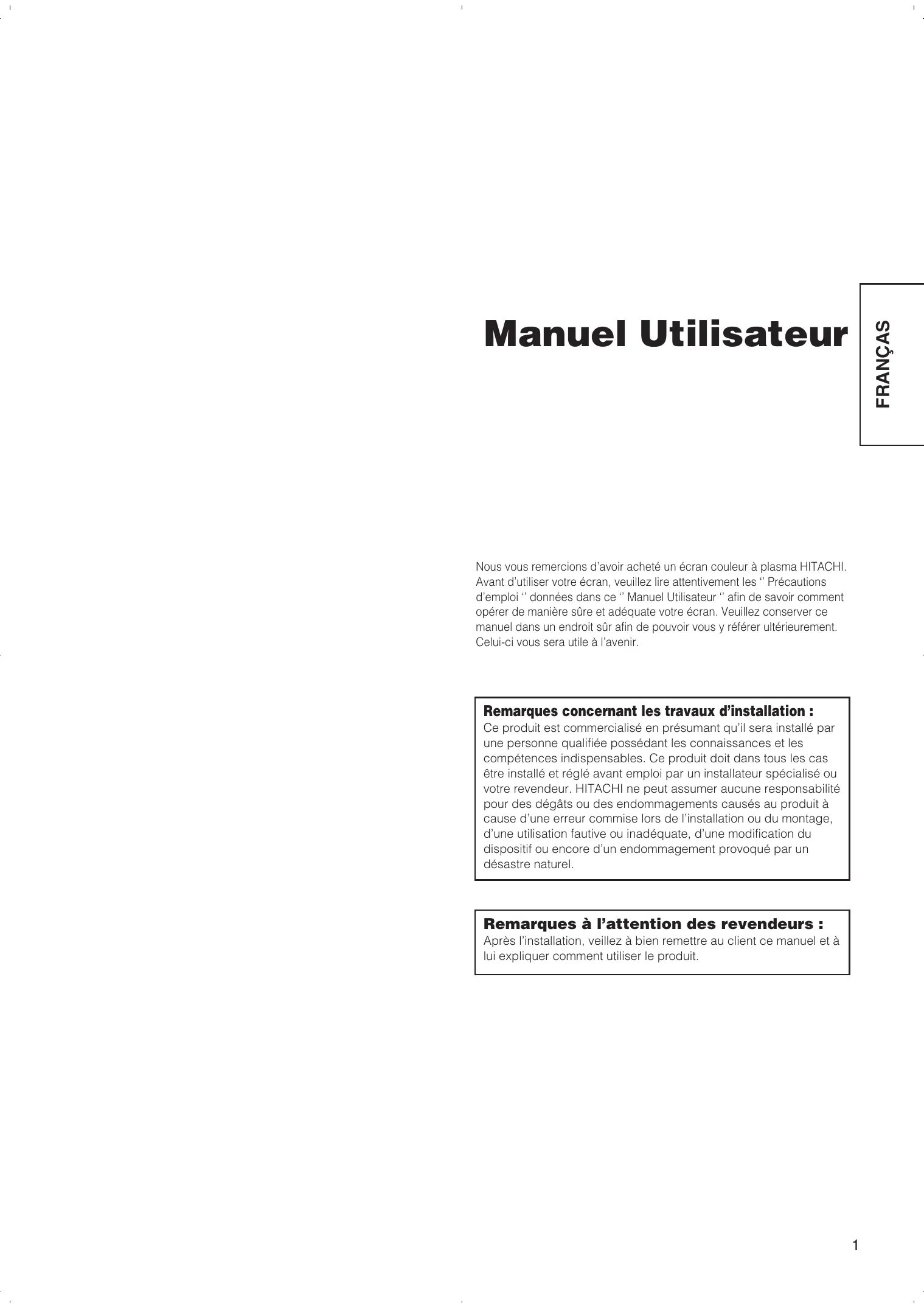Nous vous remercions d'avoir achetié un écran couleur à plasma HITACHI. Avant d'utiliser votre écran, veuillez lore attentivement les " Précautions d'emploi" données dans ce " Manuel Utilisateur " afin de savoir comment opérer de manière sure et ajustate votre écran. Veuillez conserver ce manuel dans un endroit sur afin de pouvoir vous y référer ultérieurement. Celui-ci vous sera utile à l'avir.