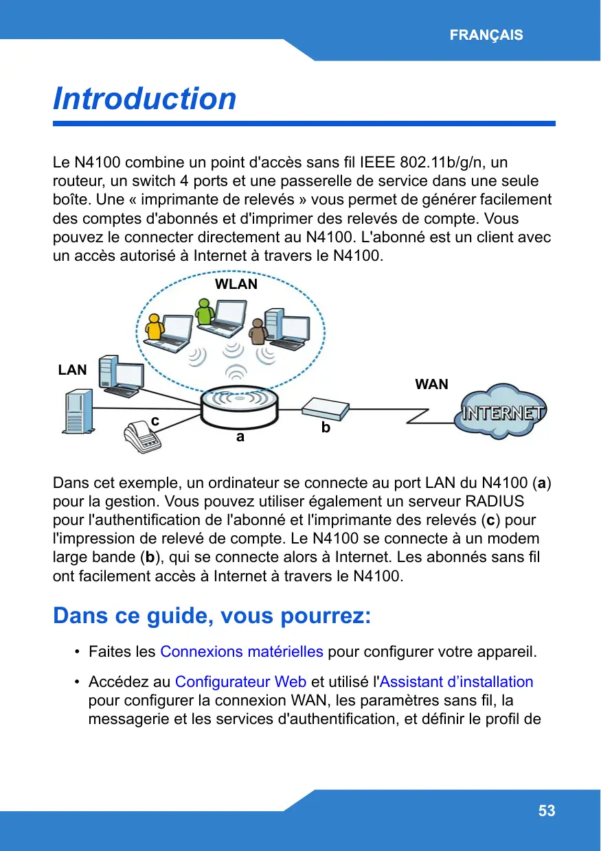 Introduction Le N4100 combine un point d'accès sans fil IEEE 802.11b/g/n, un routeur, un switch 4 ports et une passerelle de service dans une seule boîte. Une « imprimante de relevés » vous permet de générer facilement des comptes d'abonnés et d'imprimer des relevés de compte. Vous pouvez le connecter directement au N4100. L'abonné est un client avec un accès autorisé à Internet à travers le N4100.