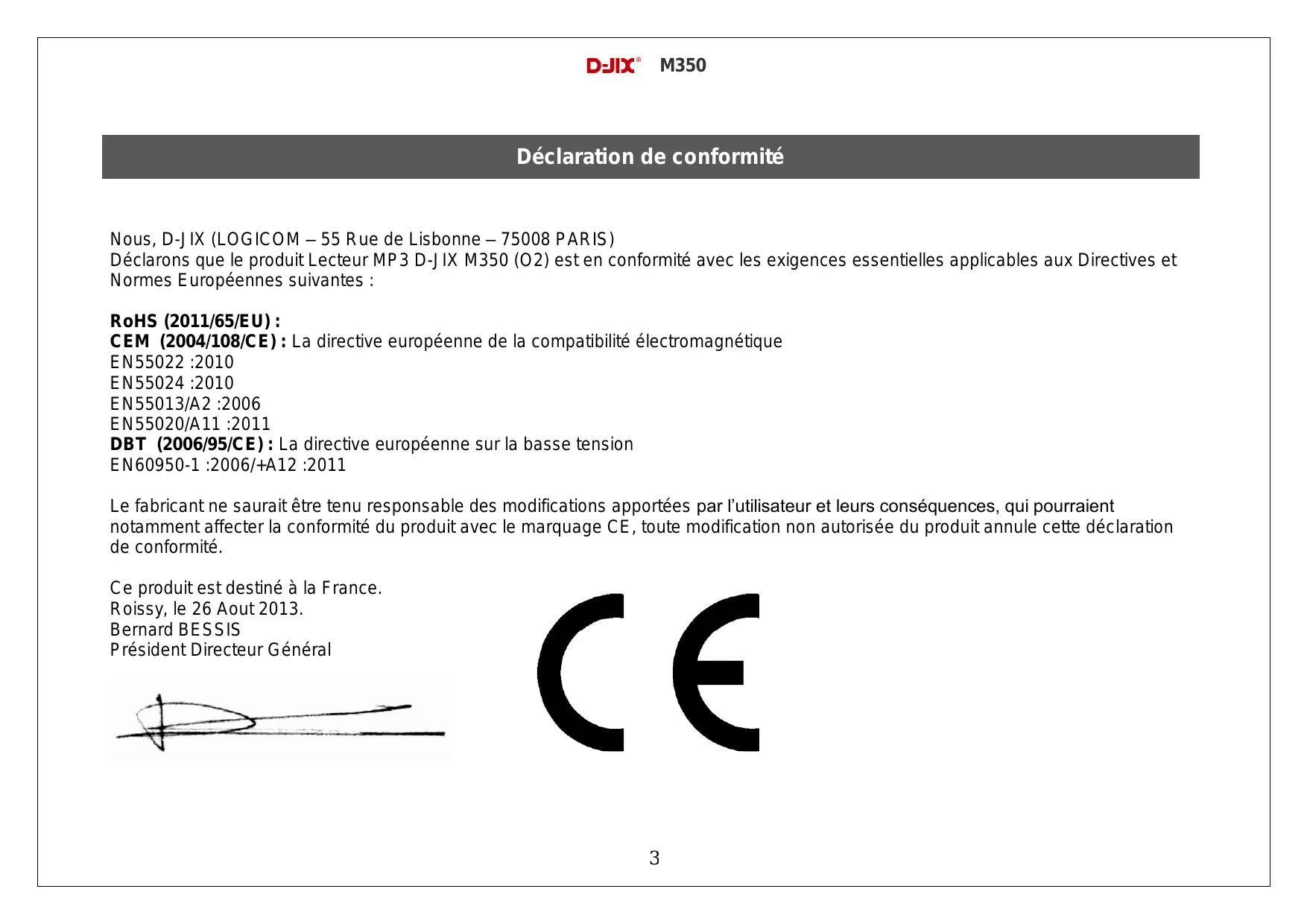 M350 Déclaration de conformité Nous, D-JIX (LOGICOM – 55 Rue de Lisbonne – 75008 PARIS) Déclarons que le produit Lecteur MP3 D-JIX M350 (O2) est en conformité avec les exigences essentielles applicables aux Directives et Normes Européennes suivantes : RoHS (2011/65/EU) : CEM (2004/108/CE) : La directive européenne de la compatibilité électromagnétique EN55022 :2010 EN55024 :2010 EN55013/A2 :2006 EN55020/A11 :2011 DBT (2006/95/CE) : La directive européenne sur la basse tension EN60950-1 :2006/+A12 :2011 Le fabricant ne saurait être tenu responsable des modifications apportées par l’utilisateur et leurs conséquences, qui pourraient notamment affecter la conformité du produit avec le marquage CE, toute modification non autorisée du produit annule cette déclaration de conformité. Ce produit est destiné à la France. Roissy, le 26 Aout 2013. Bernard BESSIS Président Directeur Général