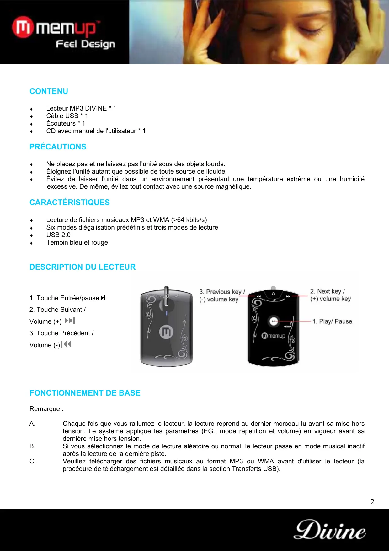 DIVINE - écouteurs MEMUP - Notice d'utilisation et mode d'emploi gratuit