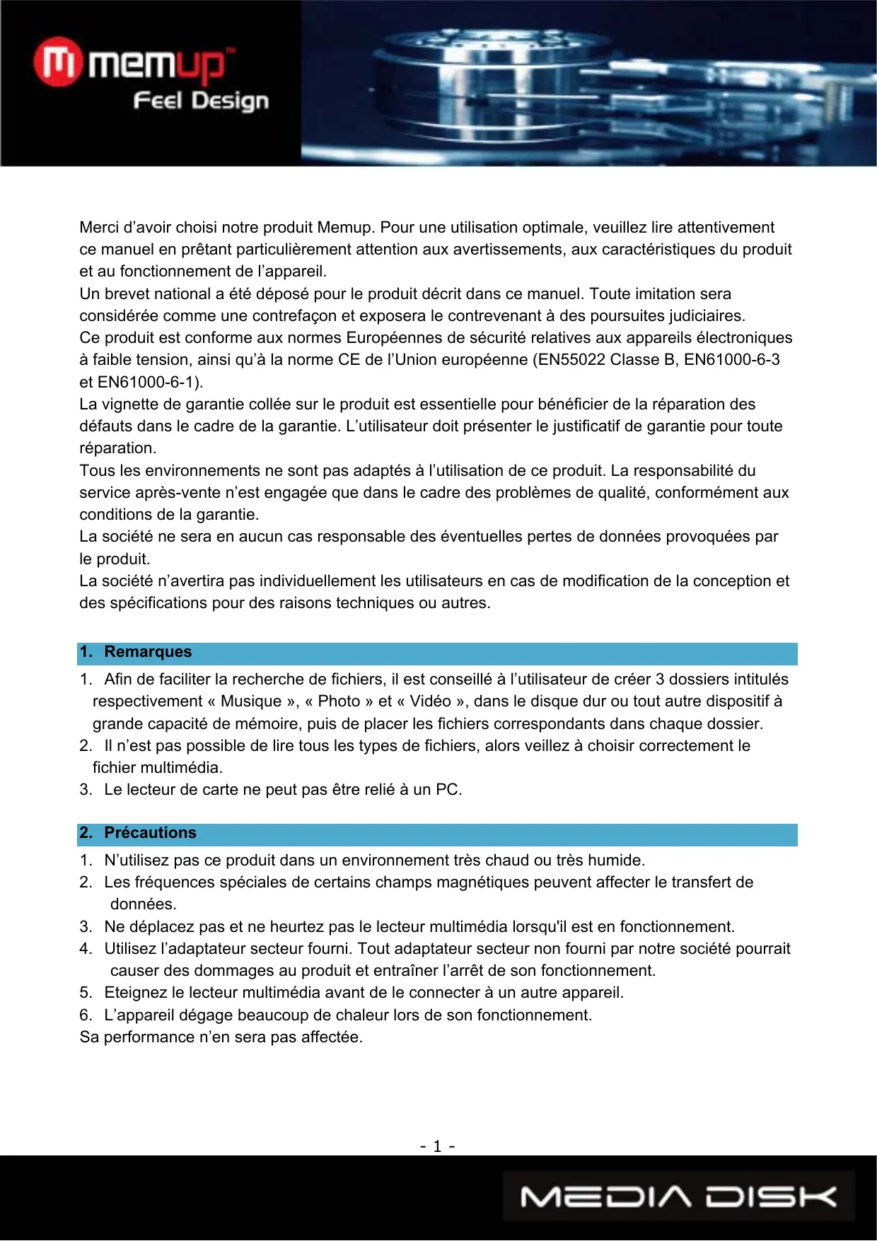 MEDIA DISK LX - Disque dur multimédia MEMUP - Notice d'utilisation et mode d'emploi gratuit