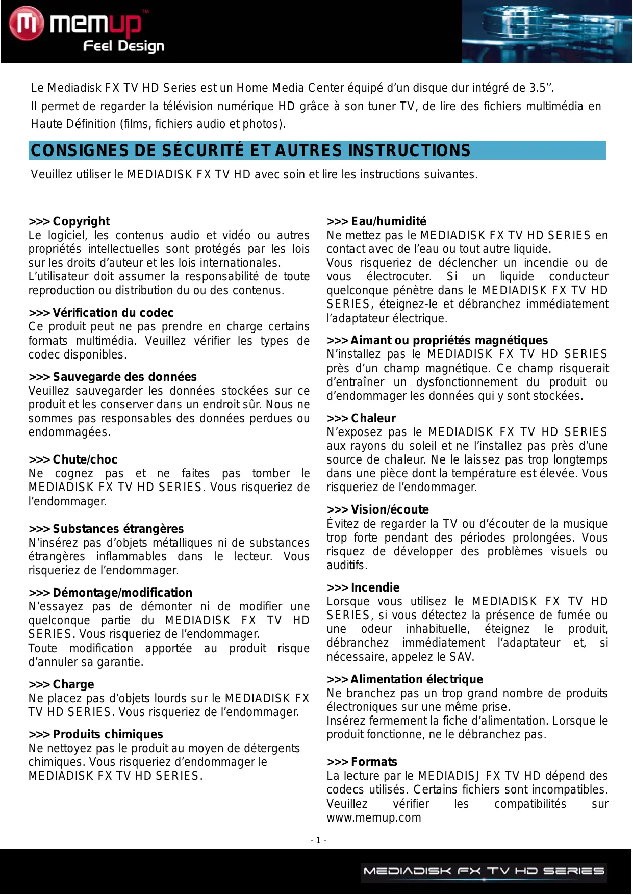 Le Mediadisk FX TV HD Series est un Home Media Center équipé d’un disque dur intégré de 3.5’’. Il permet de regarder la télévision numérique HD grâce à son tuner TV, de lire des fichiers multimédia en Haute Définition (films, fichiers audio et photos). CONSIGNES DE SÉCURITÉ ET AUTRES INSTRUCTIONS Veuillez utiliser le MEDIADISK FX TV HD avec soin et lire les instructions suivantes. >>> Copyright Le logiciel, les contenus audio et vidéo ou autres propriétés intellectuelles sont protégés par les lois sur les droits d’auteur et les lois internationales. L’utilisateur doit assumer la responsabilité de toute reproduction ou distribution du ou des contenus. >>> Eau/humidité Ne mettez pas le MEDIADISK FX TV HD SERIES en contact avec de l’eau ou tout autre liquide. Vous risqueriez de déclencher un incendie ou de vous électrocuter. Si un liquide conducteur quelconque pénètre dans le MEDIADISK FX TV HD SERIES, éteignez-le et débranchez immédiatement l’adaptateur électrique. >>> Vérification du codec Ce produit peut ne pas prendre en charge certains formats multimédia. Veuillez vérifier les types de codec disponibles. >>> Aimant ou propriétés magnétiques N’installez pas le MEDIADISK FX TV HD SERIES près d’un champ magnétique. Ce champ risquerait d’entraîner un dysfonctionnement du produit ou d’endommager les données qui y sont stockées. >>> Sauvegarde des données Veuillez sauvegarder les données stockées sur ce produit et les conserver dans un endroit sûr. Nous ne sommes pas responsables des données perdues ou endommagées. >>> Chaleur N’exposez pas le MEDIADISK FX TV HD SERIES aux rayons du soleil et ne l’installez pas près d’une source de chaleur. Ne le laissez pas trop longtemps dans une pièce dont la température est élevée. Vous risqueriez de l’endommager. >>> Chute/choc Ne cognez pas et ne faites pas tomber le MEDIADISK FX TV HD SERIES. Vous risqueriez de l’endommager. >>> Substances étrangères N’insérez pas d’objets métalliques ni de substances étrangères inflammables dans le lecteur. Vous risqueriez de l’endommager. >>> Vision/écoute Évitez de regarder la TV ou d’écouter de la musique trop forte pendant des périodes prolongées. Vous risquez de développer des problèmes visuels ou auditifs. >>> Démontage/modification N’essayez pas de démonter ni de modifier une quelconque partie du MEDIADISK FX TV HD SERIES. Vous risqueriez de l’endommager. Toute modification apportée au produit risque d’annuler sa garantie. >>> Incendie Lorsque vous utilisez le MEDIADISK FX TV HD SERIES, si vous détectez la présence de fumée ou une odeur inhabituelle, éteignez le produit, débranchez immédiatement l’adaptateur et, si nécessaire, appelez le SAV. >>> Charge Ne placez pas d’objets lourds sur le MEDIADISK FX TV HD SERIES. Vous risqueriez de l’endommager. >>> Alimentation électrique Ne branchez pas un trop grand nombre de produits électroniques sur une même prise. Insérez fermement la fiche d’alimentation. Lorsque le produit fonctionne, ne le débranchez pas. >>> Produits chimiques Ne nettoyez pas le produit au moyen de détergents chimiques. Vous risqueriez d’endommager le MEDIADISK FX TV HD SERIES. >>> Formats La lecture par le MEDIADISJ FX TV HD dépend des codecs utilisés. Certains fichiers sont incompatibles. Veuillez vérifier les compatibilités sur www.memup.com