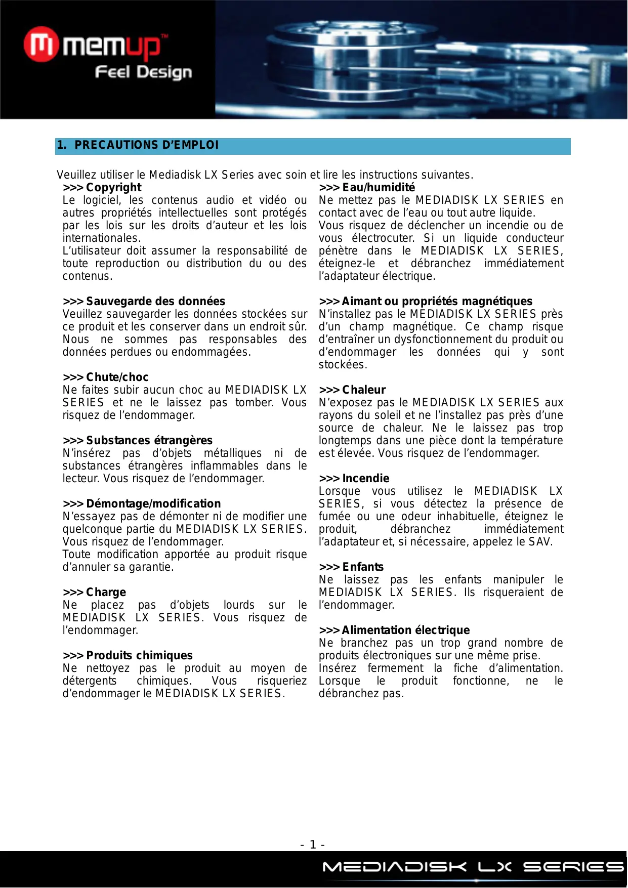 Veuillez utiliser le Mediadisk LX Series avec soin et lire les instructions suivantes. >>> Copyright >>> Eau/humidité Le logiciel, les contenus audio et vidéo ou Ne mettez pas le MEDIADISK LX SERIES en autres propriétés intellectuelles sont protégés contact avec de l’eau ou tout autre liquide. par les lois sur les droits d’auteur et les lois Vous risquez de déclencher un incendie ou de internationales. vous électrocuter. Si un liquide conducteur L’utilisateur doit assumer la responsabilité de pénètre dans le MEDIADISK LX SERIES, toute reproduction ou distribution du ou des éteignez-le et débranchez immédiatement contenus. l’adaptateur électrique. >>> Sauvegarde des données Veuillez sauvegarder les données stockées sur ce produit et les conserver dans un endroit sûr. Nous ne sommes pas responsables des données perdues ou endommagées. >>> Aimant ou propriétés magnétiques N’installez pas le MEDIADISK LX SERIES près d’un champ magnétique. Ce champ risque d’entraîner un dysfonctionnement du produit ou d’endommager les données qui y sont stockées. >>> Chute/choc Ne faites subir aucun choc au MEDIADISK LX >>> Chaleur SERIES et ne le laissez pas tomber. Vous N’exposez pas le MEDIADISK LX SERIES aux risquez de l’endommager. rayons du soleil et ne l’installez pas près d’une source de chaleur. Ne le laissez pas trop >>> Substances étrangères longtemps dans une pièce dont la température N’insérez pas d’objets métalliques ni de est élevée. Vous risquez de l’endommager. substances étrangères inflammables dans le lecteur. Vous risquez de l’endommager. >>> Incendie Lorsque vous utilisez le MEDIADISK LX >>> Démontage/modification SERIES, si vous détectez la présence de N’essayez pas de démonter ni de modifier une fumée ou une odeur inhabituelle, éteignez le quelconque partie du MEDIADISK LX SERIES. produit, débranchez immédiatement Vous risquez de l’endommager. l’adaptateur et, si nécessaire, appelez le SAV. Toute modification apportée au produit risque d’annuler sa garantie. >>> Enfants Ne laissez pas les enfants manipuler le >>> Charge MEDIADISK LX SERIES. Ils risqueraient de Ne placez pas d’objets lourds sur le l’endommager. MEDIADISK LX SERIES. Vous risquez de l’endommager. >>> Alimentation électrique Ne branchez pas un trop grand nombre de >>> Produits chimiques produits électroniques sur une même prise. Ne nettoyez pas le produit au moyen de Insérez fermement la fiche d’alimentation. détergents chimiques. Vous risqueriez Lorsque le produit fonctionne, ne le d’endommager le MEDIADISK LX SERIES. débranchez pas.