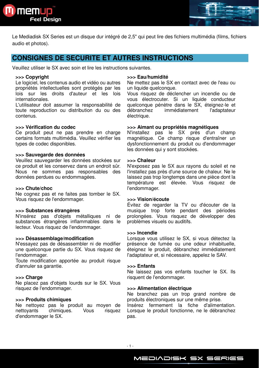 Veuillez utiliser le SX avec soin et lire les instructions suivantes. >>> Copyright Le logiciel, les contenus audio et vidéo ou autres propriétés intellectuelles sont protégés par les lois sur les droits d'auteur et les lois internationales. L'utilisateur doit assumer la responsabilité de toute reproduction ou distribution du ou des contenus. >>> Eau/humidité Ne mettez pas le SX en contact avec de l'eau ou un liquide quelconque. Vous risquez de déclencher un incendie ou de vous électrocuter. Si un liquide conducteur quelconque pénètre dans le SX, éteignez-le et débranchez immédiatement l'adaptateur électrique. >>> Vérification du codec Ce produit peut ne pas prendre en charge certains formats multimédia. Veuillez vérifier les types de codec disponibles. >>> Aimant ou propriétés magnétiques N'installez pas le SX près d'un champ magnétique. Ce champ risque d'entraîner un dysfonctionnement du produit ou d'endommager les données qui y sont stockées. >>> Sauvegarde des données Veuillez sauvegarder les données stockées sur ce produit et les conservez dans un endroit sûr. Nous ne sommes pas responsables des données perdues ou endommagées. >>> Chute/choc Ne cognez pas et ne faites pas tomber le SX. Vous risquez de l'endommager. >>> Substances étrangères N'insérez pas d'objets métalliques ni de substances étrangères inflammables dans le lecteur. Vous risquez de l'endommager. >>> Désassemblage/modification N'essayez pas de désassembler ni de modifier une quelconque partie du SX. Vous risquez de l'endommager. Toute modification apportée au produit risque d'annuler sa garantie. >>> Charge Ne placez pas d'objets lourds sur le SX. Vous risquez de l'endommager. >>> Produits chimiques Ne nettoyez pas le produit au moyen de nettoyants chimiques. Vous risquez d'endommager le SX. >>> Chaleur N'exposez pas le SX aux rayons du soleil et ne l'installez pas près d'une source de chaleur. Ne le laissez pas trop longtemps dans une pièce dont la température est élevée. Vous risquez de l'endommager. >>> Vision/écoute Évitez de regarder la TV ou d'écouter de la musique trop forte pendant des périodes prolongées. Vous risquez de développer des problèmes visuels ou auditifs. >>> Incendie Lorsque vous utilisez le SX, si vous détectez la présence de fumée ou une odeur inhabituelle, éteignez le produit, débranchez immédiatement l'adaptateur et, si nécessaire, appelez le SAV. >>> Enfants Ne laissez pas vos enfants toucher le SX. Ils risquent de l'endommager. >>> Alimentation électrique Ne branchez pas un trop grand nombre de produits électroniques sur une même prise. Insérez fermement la fiche d'alimentation. Lorsque le produit fonctionne, ne le débranchez pas.