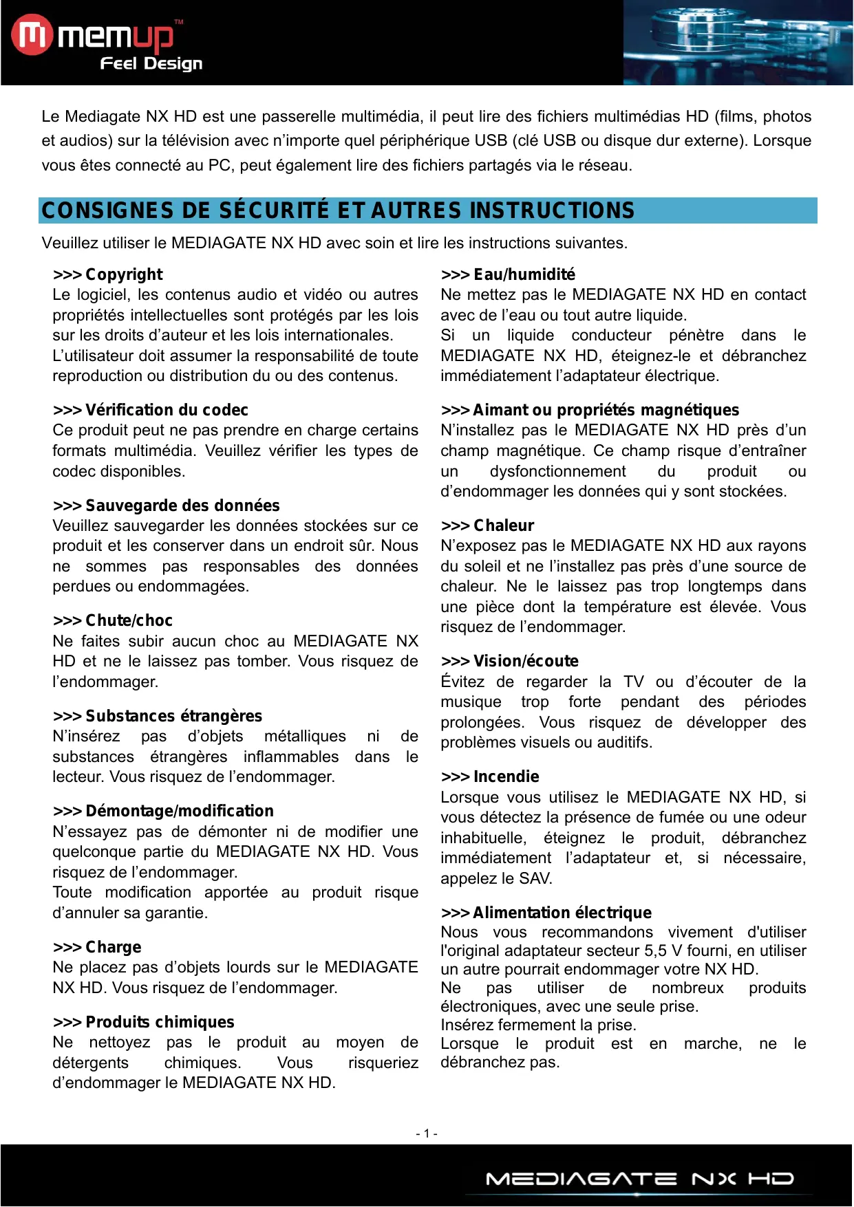 MEDIAGATE NX HD SERIES - Lecteur multimédia MEMUP - Notice d'utilisation et mode d'emploi gratuit