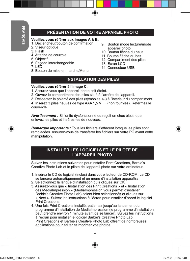 programme d’installation de MediaImpression (le programme d’installation peut prendre environ 1 minute avant de se lancer). Suivez les instructions à l’écran pour installer le logiciel Barbie’s Creative Photo Lab. Print Creations et Barbie’s Creative Photo Lab offrent de nombreuses applications pour éditer et imprimer vos photos. DJ025BB_02IM0278.indd 4