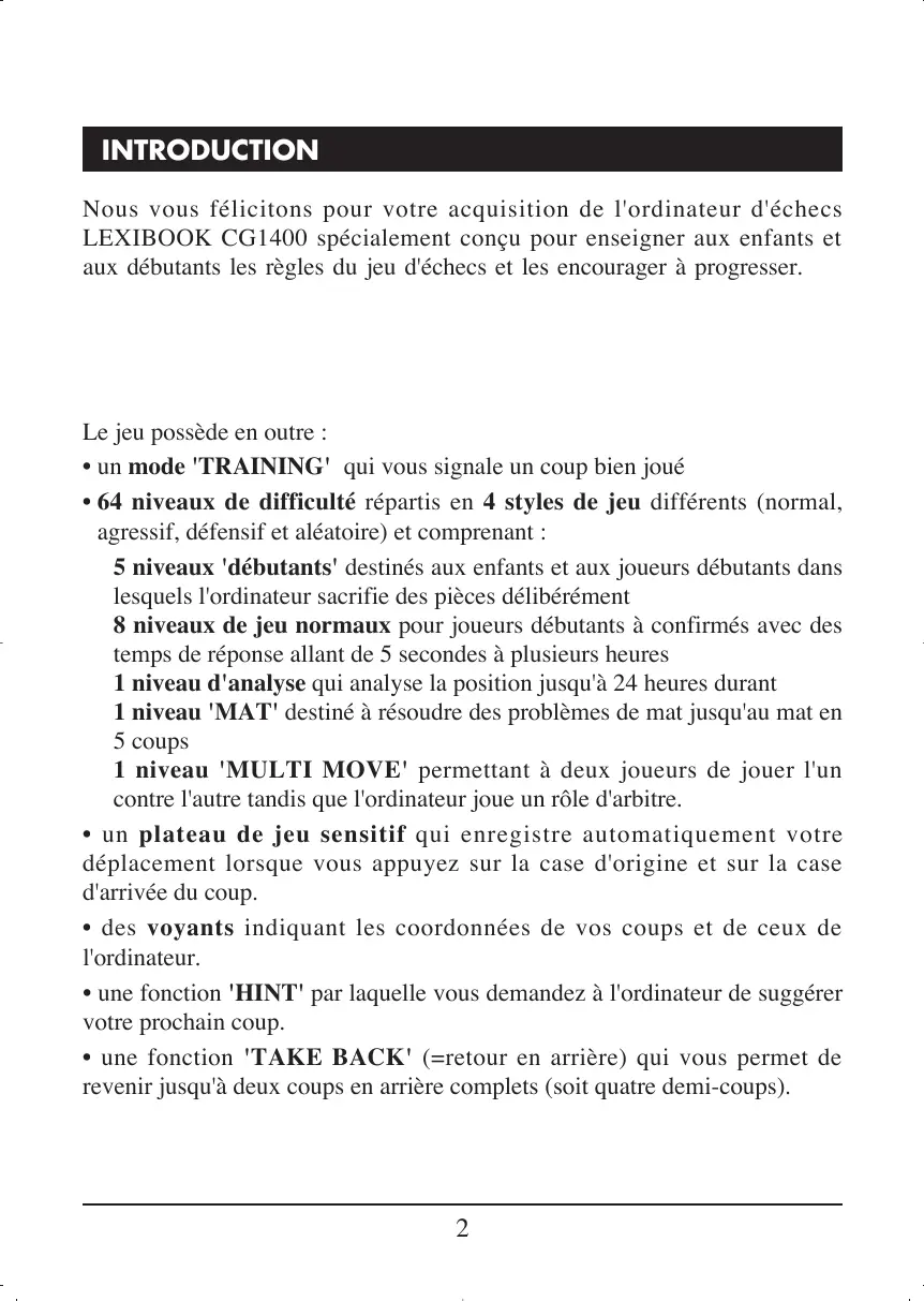 INTRODUCTION Nous vous félicitons pour votre acquisition de l'ordinateur d'échecs LEXIBOOK CG1400 spécialement conçu pour enseigner aux enfants et aux débutants les règles du jeu d'échecs et les encourager à progresser. Le livre trilingue fourni avec le jeu explique les rudiments des échecs et propose des exercices de familiarisation avec les règles et les stratégies. Le jeu possède en outre : • un mode 'TRAINING' qui vous signale un coup bien joué • 64 niveaux de difficulté répartis en 4 styles de jeu différents (normal, agressif, défensif et aléatoire) et comprenant : 5 niveaux 'débutants' destinés aux enfants et aux joueurs débutants dans lesquels l'ordinateur sacrifie des pièces délibérément 8 niveaux de jeu normaux pour joueurs débutants à confirmés avec des temps de réponse allant de 5 secondes à plusieurs heures 1 niveau d'analyse qui analyse la position jusqu'à 24 heures durant 1 niveau 'MAT' destiné à résoudre des problèmes de mat jusqu'au mat en 5 coups 1 niveau 'MULTI MOVE' permettant à deux joueurs de jouer l'un contre l'autre tandis que l'ordinateur joue un rôle d'arbitre. • un plateau de jeu sensitif qui enregistre automatiquement votre déplacement lorsque vous appuyez sur la case d'origine et sur la case d'arrivée du coup. • des voyants indiquant les coordonnées de vos coups et de ceux de l'ordinateur. • une fonction 'HINT' par laquelle vous demandez à l'ordinateur de suggérer votre prochain coup. • une fonction 'TAKE BACK' (=retour en arrière) qui vous permet de revenir jusqu'à deux coups en arrière complets (soit quatre demi-coups).