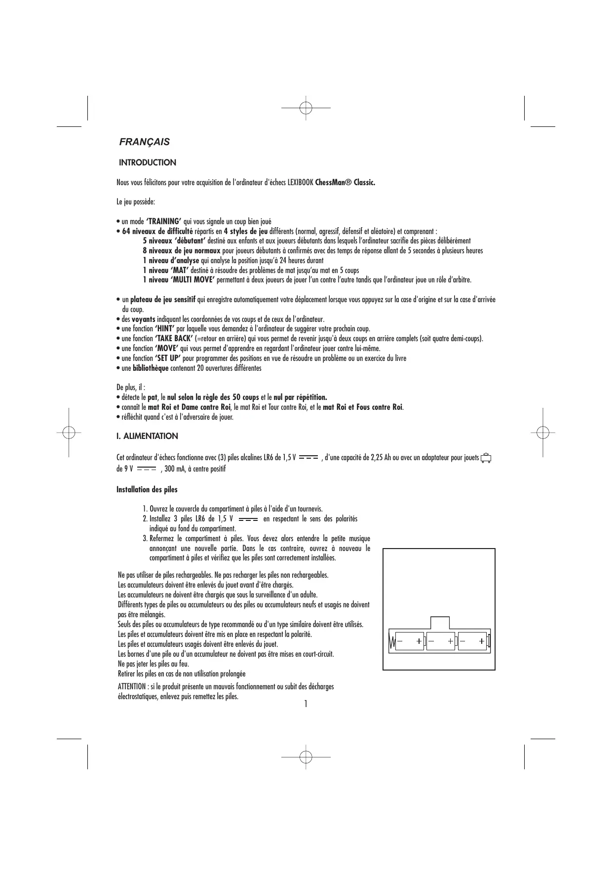 Le jeu possède: • un mode ‘TRAINING’ qui vous signale un coup bien joué • 64 niveaux de difficulté répartis en 4 styles de jeu différents (normal, agressif, défensif et aléatoire) et comprenant : 5 niveaux ‘débutant’ destiné aux enfants et aux joueurs débutants dans lesquels l’ordinateur sacrifie des pièces délibérément 8 niveaux de jeu normaux pour joueurs débutants à confirmés avec des temps de réponse allant de 5 secondes à plusieurs heures 1 niveau d’analyse qui analyse la position jusqu’à 24 heures durant 1 niveau ‘MAT’ destiné à résoudre des problèmes de mat jusqu’au mat en 5 coups 1 niveau ‘MULTI MOVE’ permettant à deux joueurs de jouer l’un contre l’autre tandis que l’ordinateur joue un rôle d’arbitre. • un plateau de jeu sensitif qui enregistre automatiquement votre déplacement lorsque vous appuyez sur la case d'origine et sur la case d'arrivée du coup. • des voyants indiquant les coordonnées de vos coups et de ceux de l'ordinateur. • une fonction ‘HINT’ par laquelle vous demandez à l'ordinateur de suggérer votre prochain coup. • une fonction ‘TAKE BACK’ (=retour en arrière) qui vous permet de revenir jusqu'à deux coups en arrière complets (soit quatre demi-coups). • une fonction ‘MOVE’ qui vous permet d'apprendre en regardant l'ordinateur jouer contre lui-même. • une fonction ‘SET UP’ pour programmer des positions en vue de résoudre un problème ou un exercice du livre • une bibliothèque contenant 20 ouvertures différentes De plus, il : • détecte le pat, le nul selon la règle des 50 coups et le nul par répétition. • connaît le mat Roi et Dame contre Roi, le mat Roi et Tour contre Roi, et le mat Roi et Fous contre Roi. • réfléchit quand c'est à l'adversaire de jouer. I. ALIMENTATION Cet ordinateur d'échecs fonctionne avec (3) piles alcalines LR6 de 1,5 V de 9 V , 300 mA, à centre positif