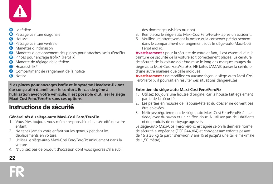 5. R emplacez le siège-auto Maxi-Cosi Fero/FeroFix après un accident. 6. Veuillez lire attentivement la notice et la conserver précieusement dans le compartiment de rangement sous le siège-auto Maxi-Cosi Fero/FeroFix. Avertissement : pour la sécurité de votre enfant, il est essentiel que la ceinture de sécurité de la voiture soit correctement placée. La ceinture de sécurité de la voiture doit être mise le long des marques rouges du siège-auto Maxi-Cosi Fero/FeroFix. NE faites JAMAIS passer la ceinture d’une autre manière que celle indiquée. Avertissement : ne modifiez en aucune façon le siège-auto Maxi-Cosi Fero/FeroFix, il pourrait en résulter des situations dangereuses. Entretien du siège-auto Maxi-Cosi Fero/FeroFix 1. Utilisez toujours une housse d’origine, car la housse fait également partie de la sécurité. 2. Les parties en mousse de l’appuie-tête et du dossier ne doivent pas être enlevées. 3. Nettoyez régulièrement le siège-auto Maxi-Cosi Fero/FeroFix à l’eau tiède, avec du savon et un chiffon doux. N’utilisez pas de lubrifiants ni de produits de nettoyage agressifs. Le siège-auto Maxi-Cosi Fero/FeroFix est agréé selon la dernière norme de sécurité européenne (ECE R44 /04) et convient aux enfants pesant de 15 à 36 kg (à partir d’environ 3 ans ½ et jusqu’à une taille maximale de 1,50 mètre).