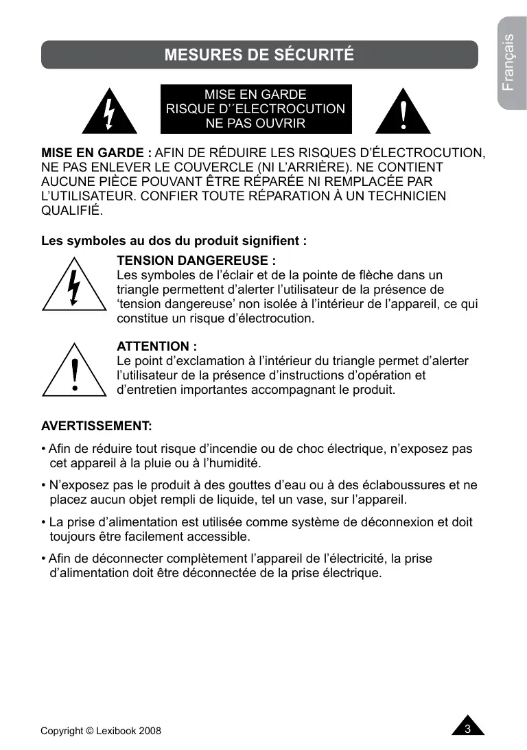 - Afin de réduire tout risque d'incendie ou de choc électrique, n'exposez pas cet appareil à la pluie ou à l'humidité.