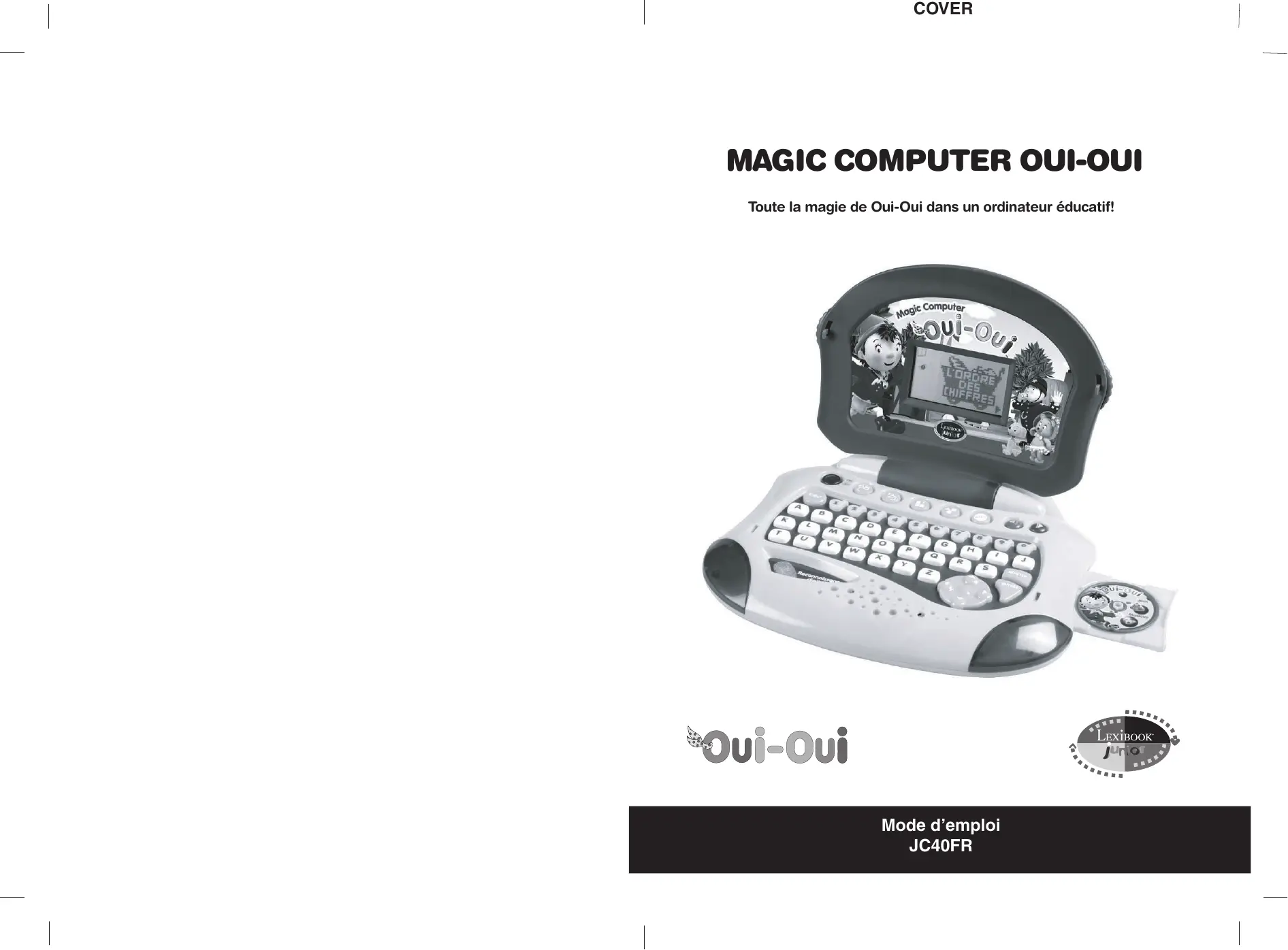 Toute la magie de Oui-Oui dans un ordinateur éducatif! Mode d’emploi JC40FR LE CLAVIER INTRODUCTION Avec le Magic Computer Oui-Oui, votre enfant apprend à grandir avec Oui-Oui, l’adorable petit pantin de bois ! Le jeu comprend 20 activités centrées sur 5 thèmes : apprentissage du français, mathématiques et géométrie, logique, musique et jeux. Oui-Oui accompagne l’enfant tout au cours des activités pour un éveil en douceur ! Pour simuler un vrai ordinateur, le Magic Computer Oui-Oui inclut un CD-ROM spécial donnant accès à des activités musicales et à des jeux. Inédit et secret : le Magic Computer Oui-Oui démarre lorsque l’enfant appuie sur le simulateur de reconnaissance digitale ! Prenez le temps de lire les instructions ci-dessous pour apprendre à vous servir de ce nouvel ordinateur et jouer à ses différentes activités. Avec la véritable voix de Oui-Oui (par Brigitte Lecordier), votre enfant est guidé, encouragé tout au long des activités. ALIMENTATION TOUCHE Le Magic Computer Oui-Oui fonctionne avec 3 piles alcalines LR6 de 1.5V Ce jeu doit être alimenté des piles spécifiées uniquement.