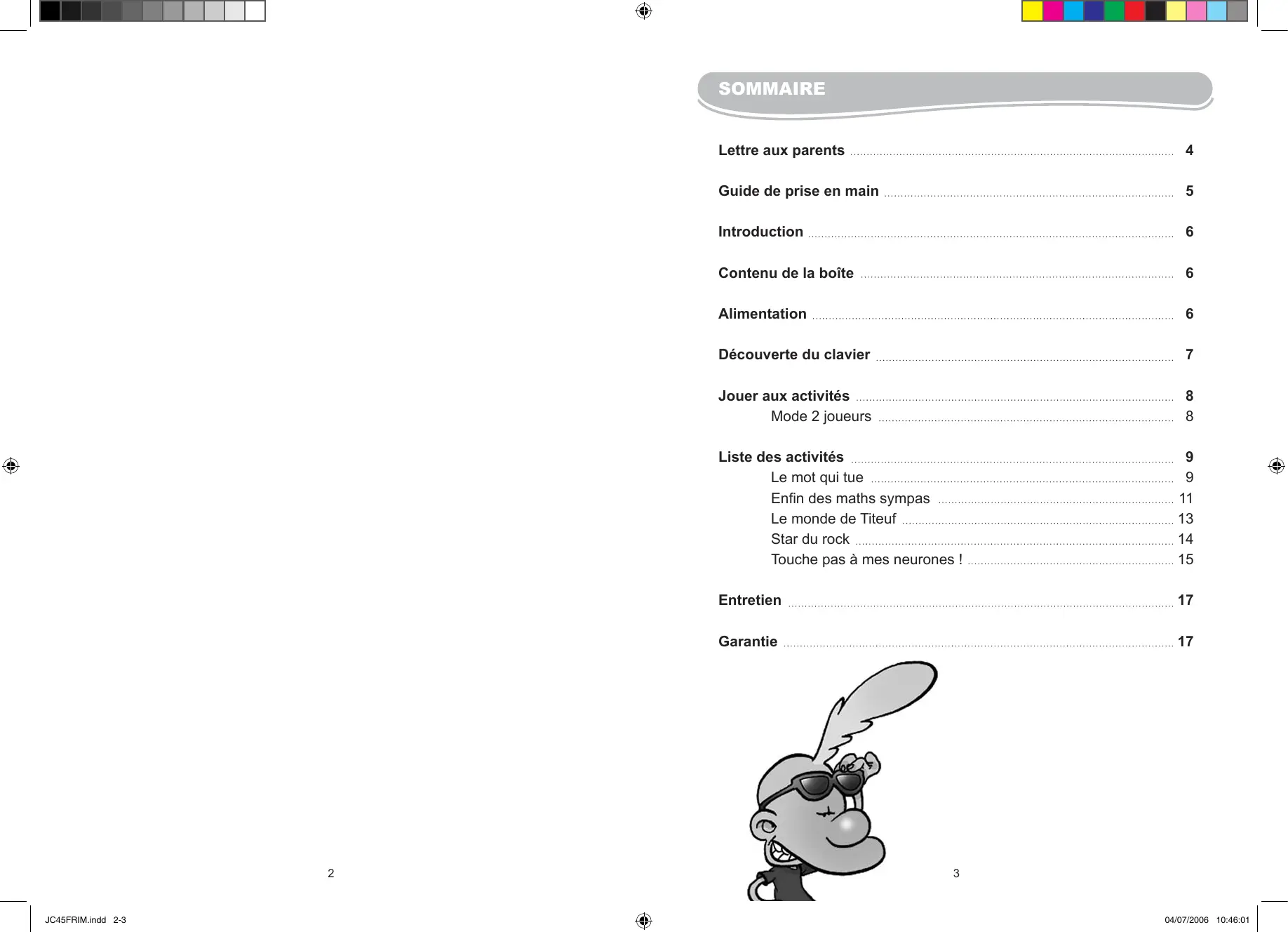 JC45FRIM.indd 6-7 Pour mettre l’ordi Titeuf en marche et l’éteindre. Note : l’ordi Titeuf s’éteint automatiquement après quelques minutes de non utilisation. Appuie sur la touche ‘Ech’ pour sortir d’une activité. Pour passer du mode 1 joueur au mode 2 joueurs dans les activités offrant cette option. Si tu n’as pas encore appuyé sur la touche « Entrer », tu peux modifier ta réponse en appuyant sur cette touche. Pour répéter une question. Note : la fonction « Répéter » n’est pas disponible dans toutes les activités. Pour afficher la réponse d’une question. Note : la fonction « Réponse » n’est pas disponible dans toutes les activités ni en mode « 2 joueurs ». Pour activer l’écriture en lettres majuscules. Touche « Entrer » pour confirmer un choix ou une réponse.