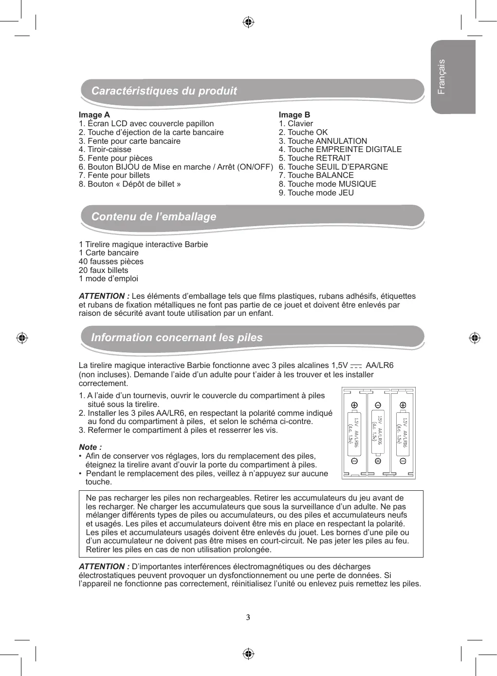 Contenu de l’emballage 1 Tirelire magique interactive Barbie 1 Carte bancaire 40 fausses pièces 20 faux billets 1 mode d’emploi ATTENTION : Les éléments d’emballage tels que films plastiques, rubans adhésifs, étiquettes et rubans de fixation métalliques ne font pas partie de ce jouet et doivent être enlevés par raison de sécurité avant toute utilisation par un enfant. Information concernant les piles La tirelire magique interactive Barbie fonctionne avec 3 piles alcalines 1,5V AA/LR6 (non incluses). Demande l’aide d’un adulte pour t’aider à les trouver et les installer correctement.