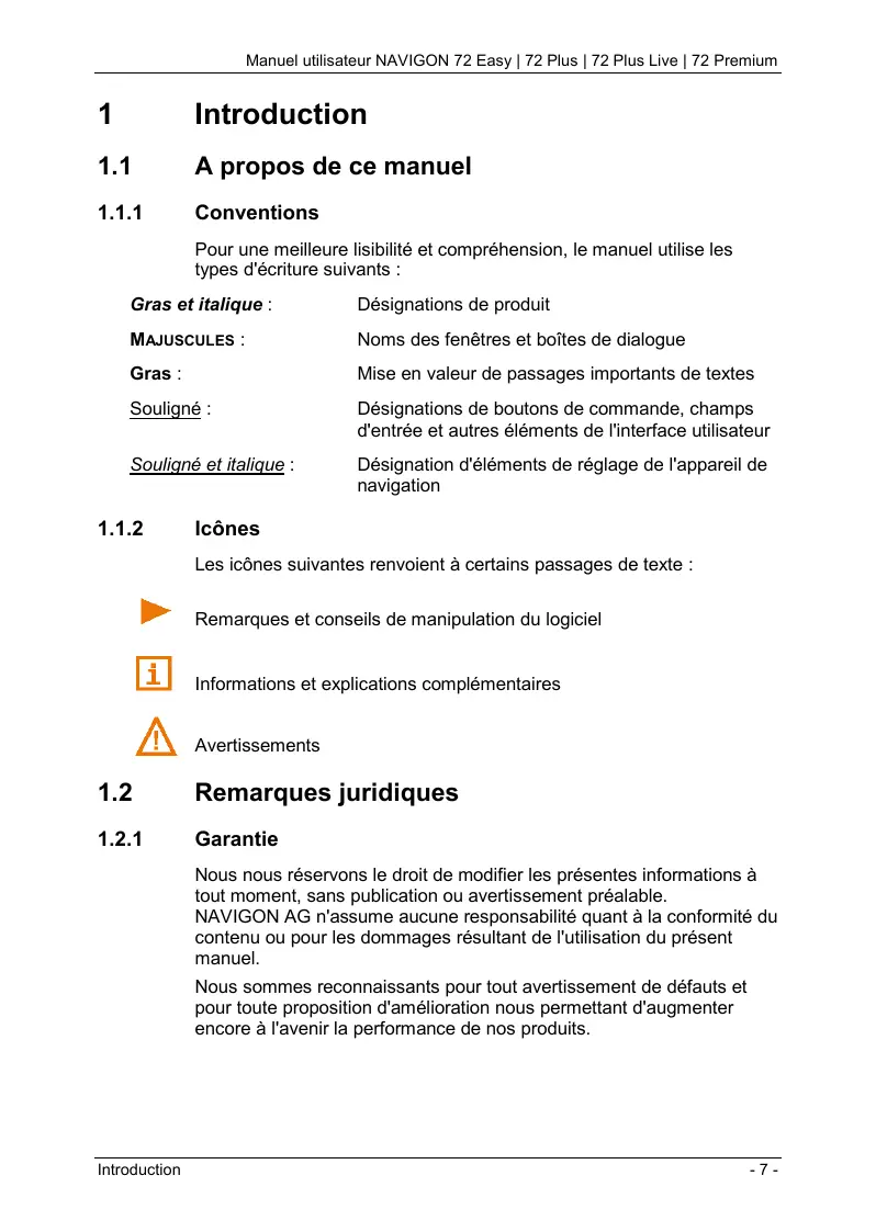 Les Presents informations peuvent être modifiées à tout moment, sans publication ou averissement préalable. Le présente manuel ou des extraits de celui-ci, quel que soit le but poursuivi, ne peuvent être produits qu'avac l'autorisation formelle de NAVIGON AG. Ils ne peuvent pas non plus être transmis sous forme électronique ou mécanique. Toutes les données techniques, illustrations etc. sont soumises à la loi de protection des droits d'auteur.