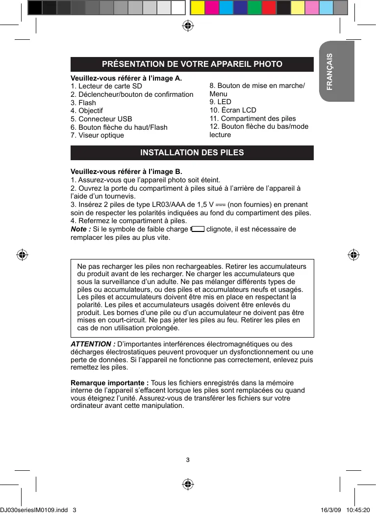 Les piles et accumulateurs doivent être mis en place en respectant la polarité. Les piles et accumulateurs usagés doivent être enlevés du produit. Les bornes d’une pile ou d’un accumulateur ne doivent pas être mises en court-circuit. Ne pas jeter les piles au feu. Retirer les piles en cas de non utilisation prolongée. ATTENTION : D’importantes interférences électromagnétiques ou des décharges électrostatiques peuvent provoquer un dysfonctionnement ou une perte de données. Si l’appareil ne fonctionne pas correctement, enlevez puis remettez les piles. Remarque importante : Tous les fichiers enregistrés dans la mémoire interne de l’appareil s’effacent lorsque les piles sont remplacées ou quand vous éteignez l’unité. Assurez-vous de transférer les fichiers sur votre ordinateur avant cette manipulation.