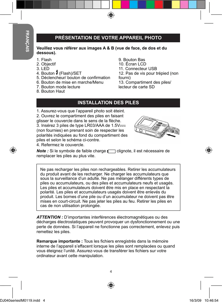 1. Assurez-vous que l’appareil photo soit éteint. 2. Ouvrez le compartiment des piles en faisant glisser le couvercle dans le sens de la flèche. 3. Insérez 3 piles de type LR03/AAA de 1.5V (non fournies) en prenant soin de respecter les polarités indiquées au fond du compartiment des piles et selon le schéma ci-contre. 4. Refermez le couvercle. Note : Si le symbole de faible charge clignote, il est nécessaire de remplacer les piles au plus vite. Ne pas recharger les piles non rechargeables. Retirer les accumulateurs du produit avant de les recharger. Ne charger les accumulateurs que sous la surveillance d’un adulte. Ne pas mélanger différents types de piles ou accumulateurs, ou des piles et accumulateurs neufs et usagés. Les piles et accumulateurs doivent être mis en place en respectant la polarité. Les piles et accumulateurs usagés doivent être enlevés du produit. Les bornes d’une pile ou d’un accumulateur ne doivent pas être mises en court-circuit. Ne pas jeter les piles au feu. Retirer les piles en cas de non utilisation prolongée. ATTENTION : D’importantes interférences électromagnétiques ou des décharges électrostatiques peuvent provoquer un dysfonctionnement ou une perte de données. Si l’appareil ne fonctionne pas correctement, enlevez puis remettez les piles. Remarque importante : Tous les fichiers enregistrés dans la mémoire interne de l’appareil s’effacent lorsque les piles sont remplacées ou quand vous éteignez l’unité. Assurez-vous de transférer les fichiers sur votre ordinateur avant cette manipulation.