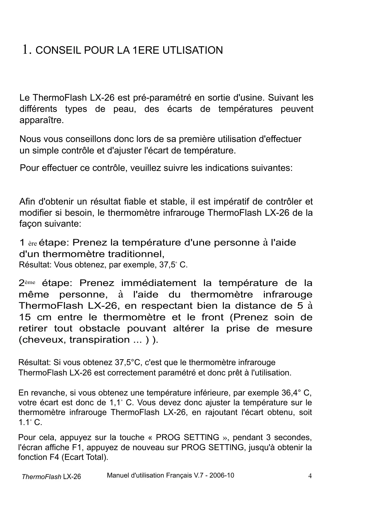 Le ThermoFlash LX-26 est pré-paramétré en sortie d'usine. Suivant les différents types de peau, des écarts de températures peuvent apparaître. Nous vous conseillons donc lors de sa première utilisation d'effectuer un simple contrôle et d'ajuster l'écart de température. Pour effectuer ce contrôle, veuillez suivre les indications suivantes: Afin d'obtenir un résultat fiable et stable, il est impératif de contrôler et modifier si besoin, le thermomètre infrarouge ThermoFlash LX-26 de la façon suivante: 1 ère étape: Prenez la température d'une personne à l'aide d'un thermomètre traditionnel, Résultat: Vous obtenez, par exemple, 37,5° C. 2ème étape: Prenez immédiatement la température de la même personne, à l'aide du thermomètre infrarouge ThermoFlash LX-26, en respectant bien la distance de 5 à 15 cm entre le thermomètre et le front (Prenez soin de retirer tout obstacle pouvant altérer la prise de mesure (cheveux, transpiration ... ) ). Résultat: Si vous obtenez 37,5°C, c'est que le thermomètre infrarouge ThermoFlash LX-26 est correctement paramétré et donc prêt à l'utilisation. En revanche, si vous obtenez une température inférieure, par exemple 36,4° C, votre écart est donc de 1,1° C. Vous devez donc ajuster la température sur le thermomètre infrarouge ThermoFlash LX-26, en rajoutant l'écart obtenu, soit 1.1° C. Pour cela, appuyez sur la touche « PROG SETTlNG », pendant 3 secondes, l'écran affiche F1, appuyez de nouveau sur PROG SETTlNG, jusqu'à obtenir la fonction F4 (Ecart Total). ThermoFlash LX-26 Manuel d'utilisation Français V.7 - 2006-10