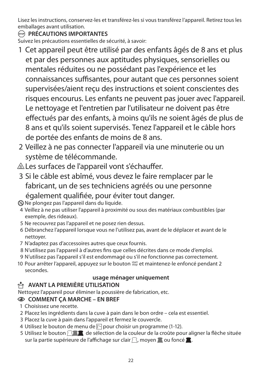 Laissez un espace libre d’au moins 50 mm autour de l’appareil. Ouvrez le couvercle. Utilisez la poignée pour extraire la cuve à pain de l'appareil. Fixez le mélangeur à la tige dans le fond de la cuve à pain. La tige et le trou du mélangeur présentent une forme de D. Préparez une grille métallique (pour le pain), un dessous de plat résistant à la chaleur (pour la cuve à pain) et des gants de cuisine. 18 Il est essentiel que les ingrédients soient mesurés avec précision. 19 Utilisez les mêmes cuillères à mesurer pour tous les ingrédients. 20 Nivelez les cuillères avec le dos d'un couteau. 21 N'utilisez pas un verre doseur – les balances électroniques sont beaucoup plus précises et il est donc préférable de peser l'eau. 22 1 millilitre d'eau pèse 1 gramme. Dans les recettes, nous indiquons l'eau en grammes (g), plutôt qu'en millilitres (ml). 23 Si vous souhaitez tout de même utiliser un verre doseur, 1 millilitre d'eau pèse 1 gramme et vous pouvez remplacer les grammes “g” par des millilitres “ml”, mais il est possible que les résultats ne soient pas réguliers. 24 Si vous utilisez une recette obtenue ailleurs, remplacez les millilitres (ml) d'eau par des grammes (g) à des fins de précision. 25 Il est essentiel que vous ajoutiez les ingrédients dans le bon ordre. 26 Nous les avons numérotés pour vous faciliter la tâche. 27 En premier lieu, ajoutez le liquide. 28 Il s'agit généralement d'eau, mais le liquide peut aussi inclure du lait et/ou des œufs. 29 Le lait/l'eau doivent être tièdes (20°C-25°C/68°F-77°F). 30 L'eau chaude tout comme l'eau froide va inhiber la levure. 31 Ajoutez le sucre et le sel, si nécessaire. 32 Ajoutez les ingrédients humides – miel, sirop, mélasse... 33 Ajoutez les ingrédients secs – farine, lait en poudre, herbes aromatiques, épices... 34 Pour terminer, ajoutez la levure sèche (ou poudre à lever/bicarbonate de sodium). 35 Déposez cet ingrédient sur le dessus et ne le mouillez pas, faute de quoi il commencerait à agir trop tôt. , Si vous utilisez la minuterie, il est encore plus important que la levure et l'eau soient bien séparées. 36 Les noix, les raisins secs, etc. sont généralement ajoutés lors du deuxième pétrissage. 23