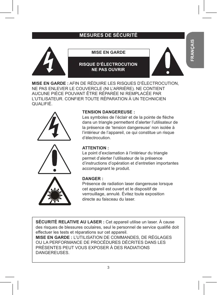 SÉCURITÉ RELATIVE AU LASER : Cet appareil utilise un laser. À cause des risques de blessures oculaires, seul le personnel de service qualifié doit effectuer les tests et réparations sur cet appareil.