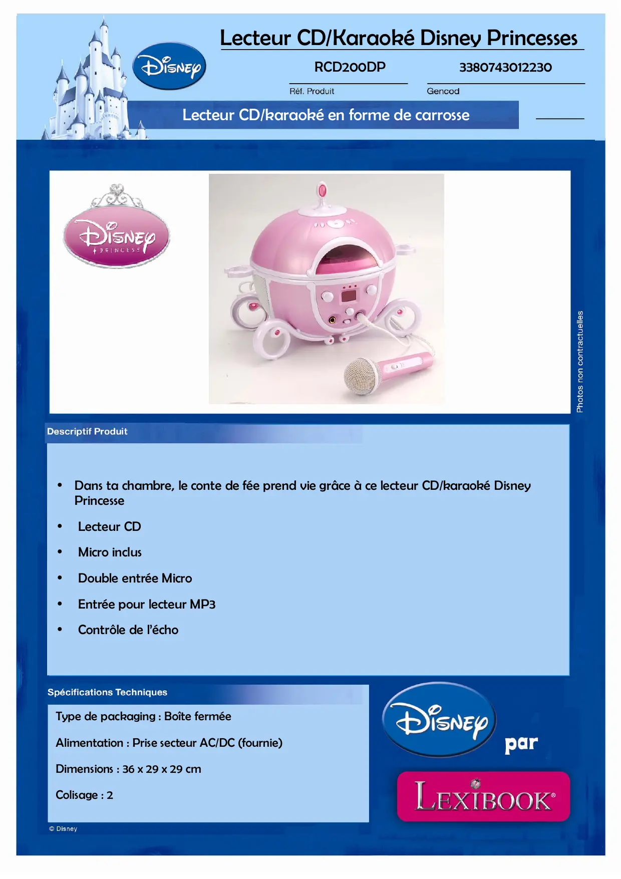 | Caractéristiques techniques principales | Lecteur CD, radio FM, entrée AUX, affichage LCD |