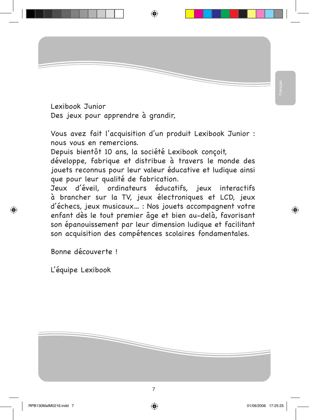 Lexibook Junior Des jeux pour apprendre à grandir, Vous avez fait l’acquisition d’un produit Lexibook Junior : nous vous en remercions. Depuis bientôt 10 ans, la société Lexibook conçoit, développe, fabrique et distribue à travers le monde des jouets reconnus pour leur valeur éducative et ludique ainsi que pour leur qualité de fabrication. Jeux d’éveil, ordinateurs éducatifs, jeux interactifs à brancher sur la TV, jeux électroniques et LCD, jeux d’échecs, jeux musicaux… : Nos jouets accompagnent votre enfant dès le tout premier âge et bien au-delà, favorisant son épanouissement par leur dimension ludique et facilitant son acquisition des compétences scolaires fondamentales. Bonne découverte ! L’équipe Lexibook