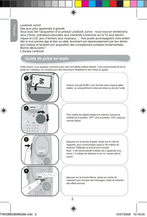 2 talkies-walkies Barbie Un manuel d’utilisation ATTENTION : Les éléments d’emballage tels que films plastiques, rubans adhésifs, étiquettes et rubans de fixation métalliques ne font pas partie de ce jouet et doivent être enlevés par raison de sécurité avant toute utilisation par un enfant.