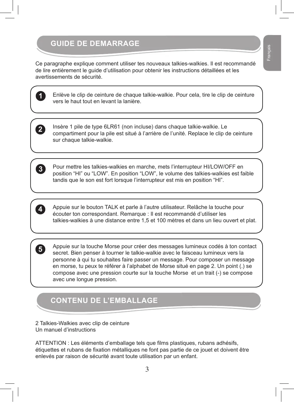 2 Talkies-Walkies avec clip de ceinture Un manuel d’instructions ATTENTION : Les éléments d’emballage tels que films plastiques, rubans adhésifs, étiquettes et rubans de fixation métalliques ne font pas partie de ce jouet et doivent être enlevés par raison de sécurité avant toute utilisation par un enfant.