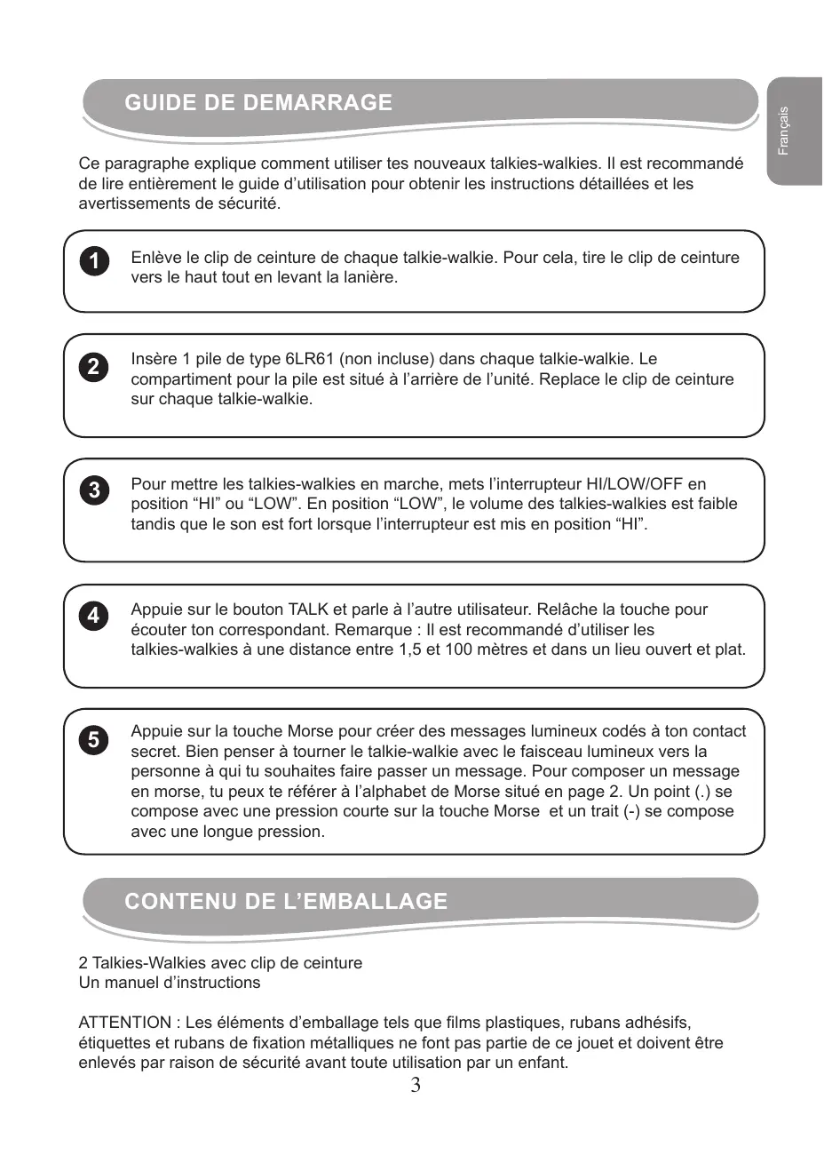 2 Talkies-Walkies avec clip de ceinture Un manuel d’instructions ATTENTION : Les éléments d’emballage tels que films plastiques, rubans adhésifs, étiquettes et rubans de fixation métalliques ne font pas partie de ce jouet et doivent être enlevés par raison de sécurité avant toute utilisation par un enfant.