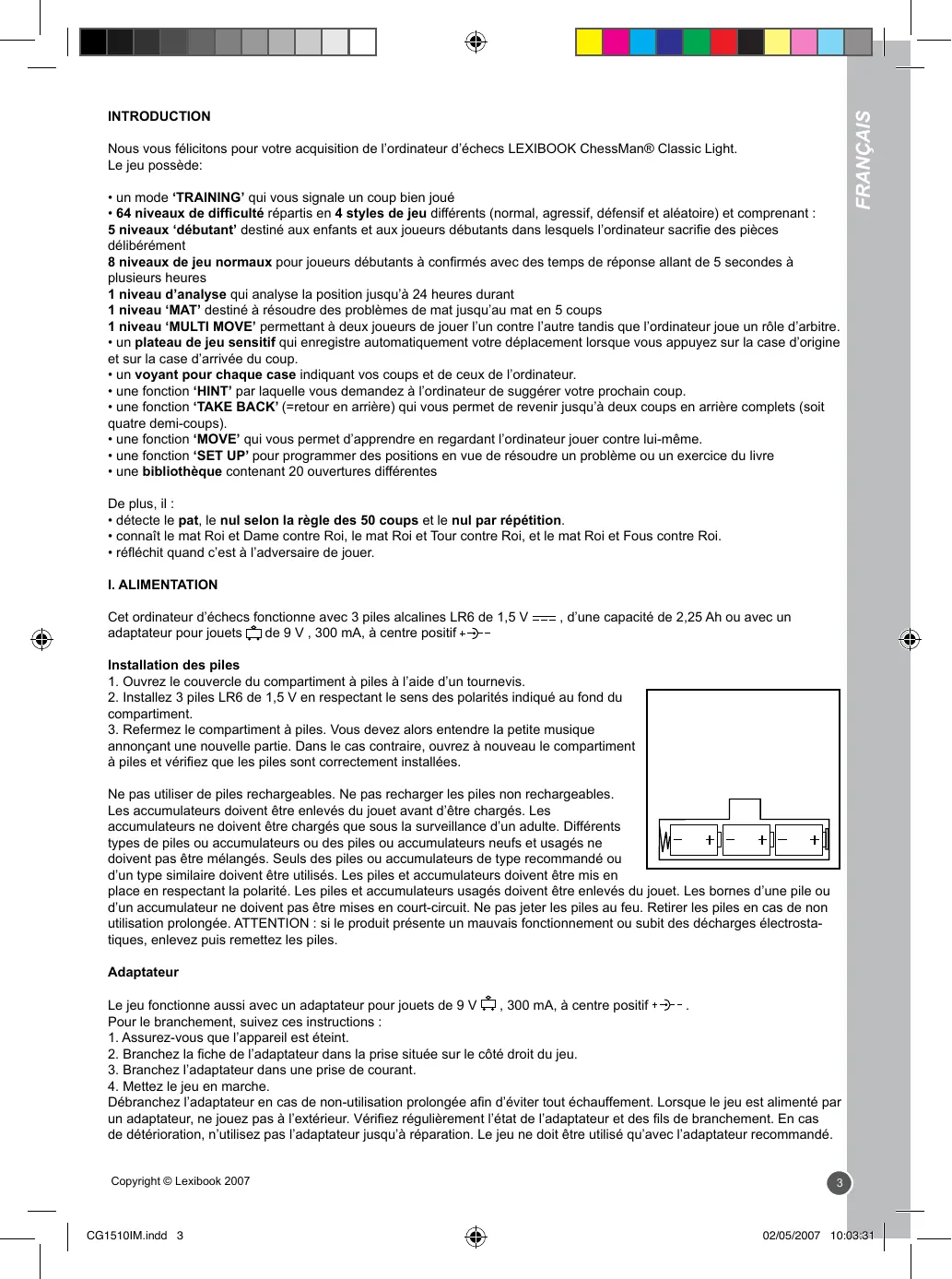 Débranchez l’adaptateur en cas de non-utilisation prolongée afin d’éviter tout échauffement. Lorsque le jeu est alimenté par un adaptateur, ne jouez pas à l’extérieur. Vérifiez régulièrement l’état de l’adaptateur et des fils de branchement. En cas de détérioration, n’utilisez pas l’adaptateur jusqu’à réparation. Le jeu ne doit être utilisé qu’avec l’adaptateur recommandé. Copyright © Lexibook 2007 CG1510IM.indd 3