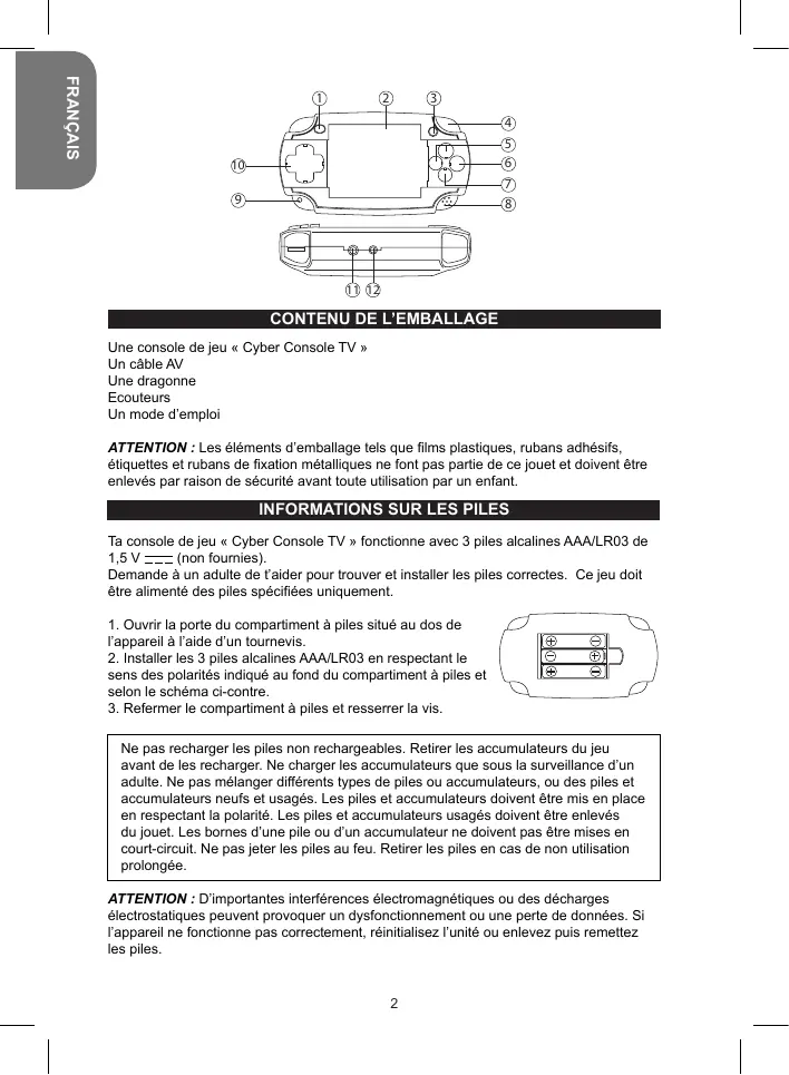 Ne pas recharger les piles non rechargeables. Retirer les accumulateurs du jeu avant de les recharger. Ne charger les accumulateurs que sous la surveillance d’un adulte. Ne pas mélanger différents types de piles ou accumulateurs, ou des piles et accumulateurs neufs et usagés. Les piles et accumulateurs doivent être mis en place en respectant la polarité. Les piles et accumulateurs usagés doivent être enlevés du jouet. Les bornes d’une pile ou d’un accumulateur ne doivent pas être mises en court-circuit. Ne pas jeter les piles au feu. Retirer les piles en cas de non utilisation prolongée. ATTENTION : D’importantes interférences électromagnétiques ou des décharges électrostatiques peuvent provoquer un dysfonctionnement ou une perte de données. Si l’appareil ne fonctionne pas correctement, réinitialisez l’unité ou enlevez puis remettez les piles.