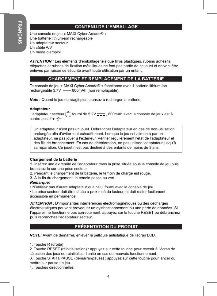 Une console de jeu « MAXI Cyber Arcade® » Une batterie lithium-ion rechargeable Un adaptateur secteur Un câble A/V Un mode d’emploi ATTENTION : Les éléments d’emballage tels que films plastiques, rubans adhésifs, étiquettes et rubans de fixation métalliques ne font pas partie de ce jouet et doivent être enlevés par raison de sécurité avant toute utilisation par un enfant.