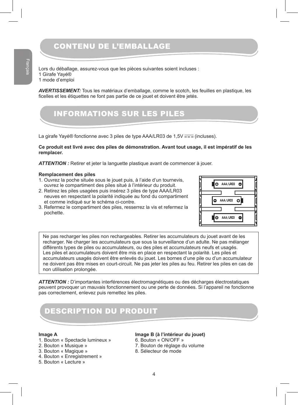 Ne pas recharger les piles non rechargeables. Retirer les accumulateurs du jouet avant de les recharger. Ne charger les accumulateurs que sous la surveillance d'un adulte. Ne pas mélanger différents types de piles ou accumulateurs, ou des piles et accumulateurs neufs et usages. Les piles et accumulateurs doivent être mis en place en respectant la polarité. Les piles et accumulateurs usages doivent être enlevés du jouet. Les bornes d'une pile ou d'un accumulateur ne doivent pas été mises en court-circuit. Ne pas jeter les piles au feu. Retirer les piles en cas de non utilisation prolongée.