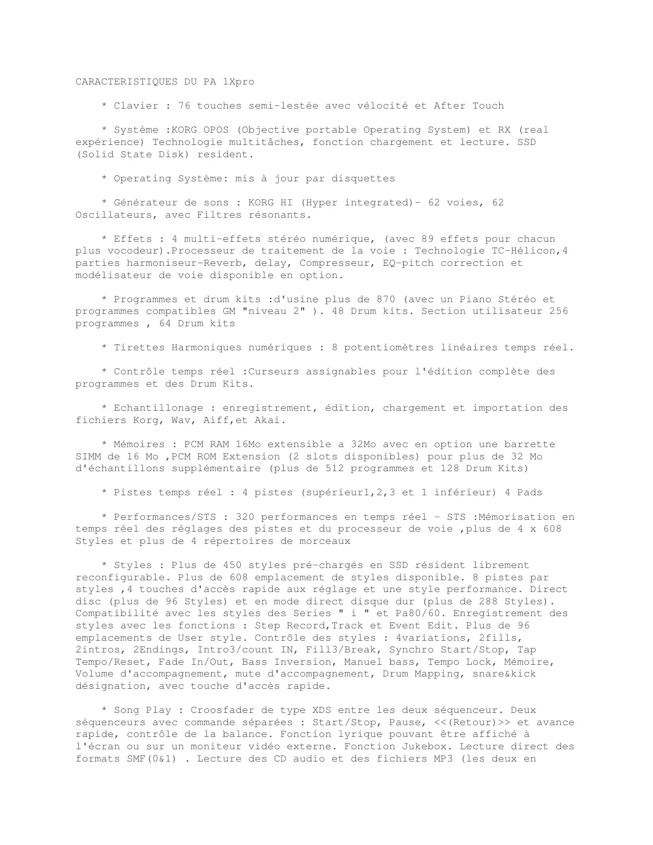 Séquenceur :Enregistrement rapide (Backing Sequence), fonctions multipistes et enregistrement pas a pas. Toutes fonctions de séquenceur disponible.16 pistes plus de 200000 notes, format SMF natif, lecteur encodeur MP3 (en option) carte optionnelle KORG EXBP-MP3. Lecteur enregistreur de CD audio (en option) carte optionnelle KORG CDRW-1. Fonction disponible à partir de l'OS 2.0