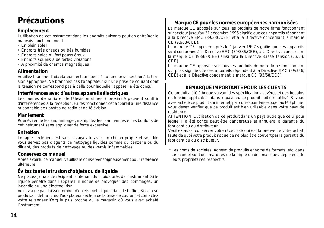 La marque CE appossee sur tous les produits de notre firme fonctionnant sur secteur jusqu'au 31 décembre 1996 signifie que ces apparéils répondent à la Directive EMC (89/336/CEE) et à la Directive concernant la marque CE (93/68/CEE).