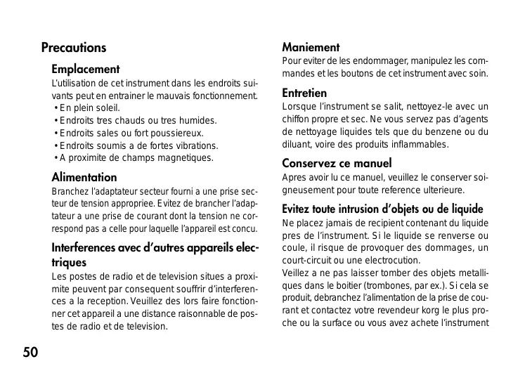 Veillez a ne pas laisser tomber des objets metalliques dans le boitier (trombones, par ex.). Si cela se produit, debranchez l'alimentation de la prise de courant et contactez votre revendeur korg le plus proche ou la surface ou vous avez achete l'instrument