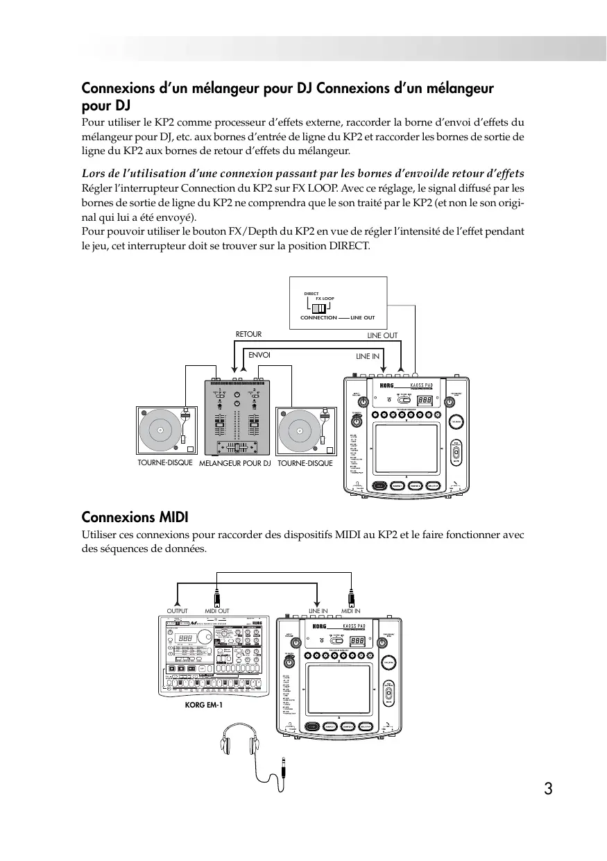 Lors de l'utilisation d'une connexion passant par les bornes d'envoi et de retour d'effets, régler l'interrupteur Connection du KP2 sur FX LOOP. Avec ce réglage, le signal diffusé pa ne comprendra que le son traité par le KP2 (et non le son original qui lui a été envoyé).