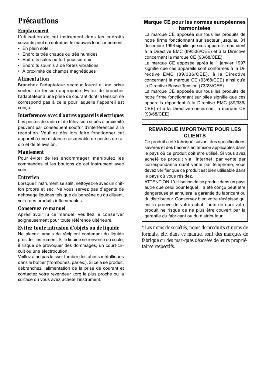 La marque CE apposseé sur tous les produits de notre firme fonctionnant sur secteur jusqu'au 31 décembre 1996 signifie que ces apparueils répondent à la Directive EMC (89/336/CEE) et à la Directive concernant la marque CE (93/68/CEE).