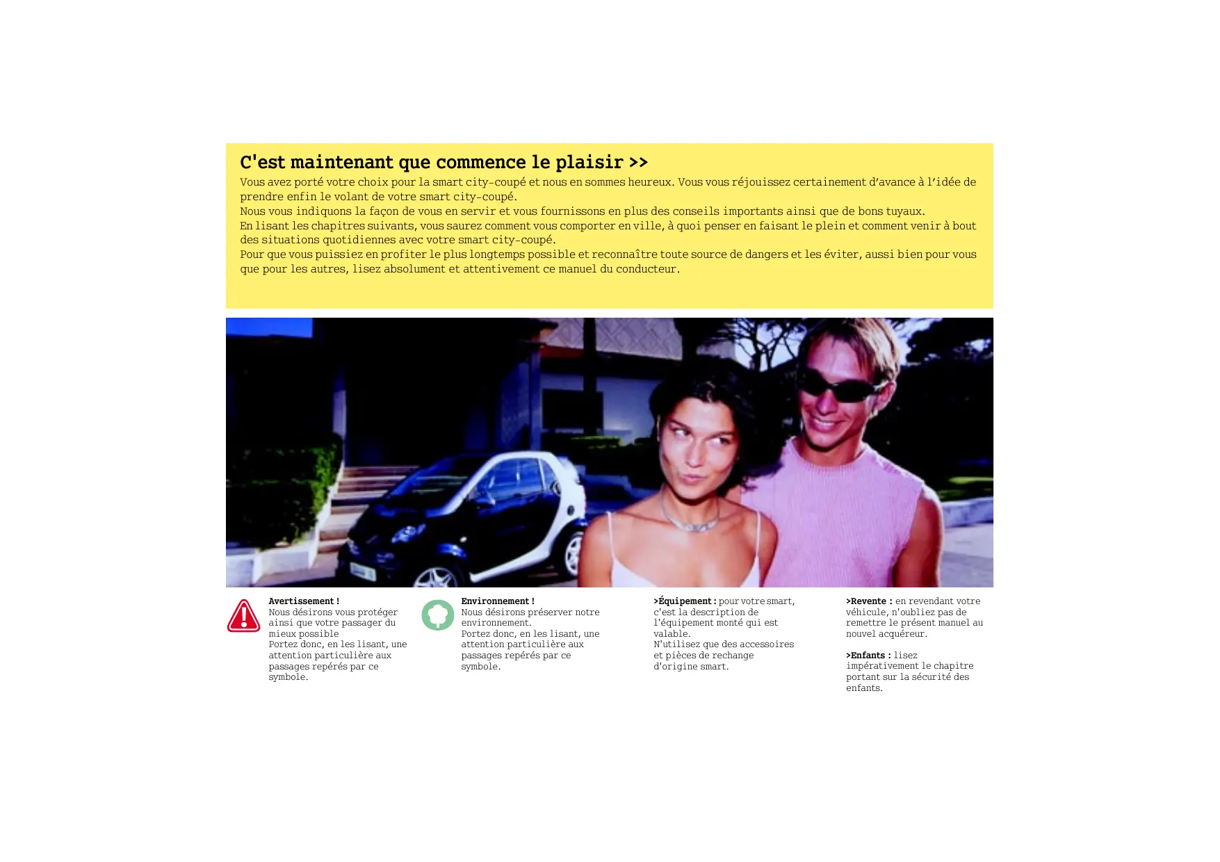 - Manuel du conducteur smart city-coupé et smart cabriolet smart - une marque de DaimlerChrysler Sommaire F-2 C'est maintenant que commence le plaisir >> Vous avez porté votre choix pour la smart city-coupé et nous en sommes heureux. Vous vous réjouissez certainement d’avance à l’idée de prendre enfin le volant de votre smart city-coupé. Nous vous indiquons la façon de vous en servir et vous fournissons en plus des conseils importants ainsi que de bons tuyaux. En lisant les chapitres suivants, vous saurez comment vous comporter en ville, à quoi penser en faisant le plein et comment venir à bout des situations quotidiennes avec votre smart city-coupé. Pour que vous puissiez en profiter le plus longtemps possible et reconnaître toute source de dangers et les éviter, aussi bien pour vous que pour les autres, lisez absolument et attentivement ce manuel du conducteur. Avertissement ! Nous désirons vous protéger ainsi que votre passager du mieux possible Portez donc, en les lisant, une attention particulière aux passages repérés par ce symbole. Environnement ! Nous désirons préserver notre environnement. Portez donc, en les lisant, une attention particulière aux passages repérés par ce symbole. >Équipement : pour votre smart, c'est la description de l'équipement monté qui est valable. N'utilisez que des accessoires et pièces de rechange d'origine smart. >Revente : en revendant votre véhicule, n'oubliez pas de remettre le présent manuel au nouvel acquéreur. >Enfants : lisez impérativement le chapitre portant sur la sécurité des enfants. Sommaire Première rencontre >> Communication >> Ouverture et fermeture p. 1
